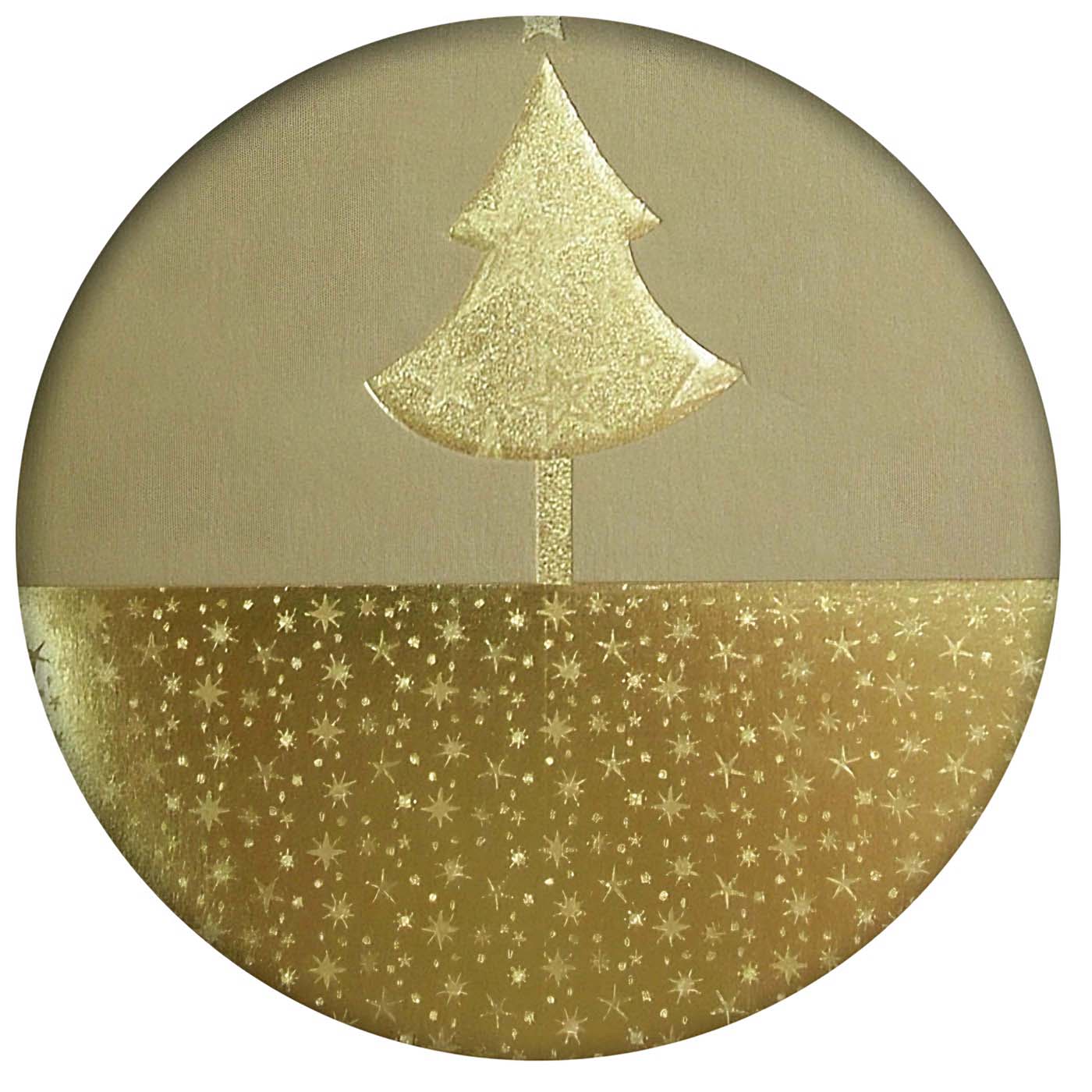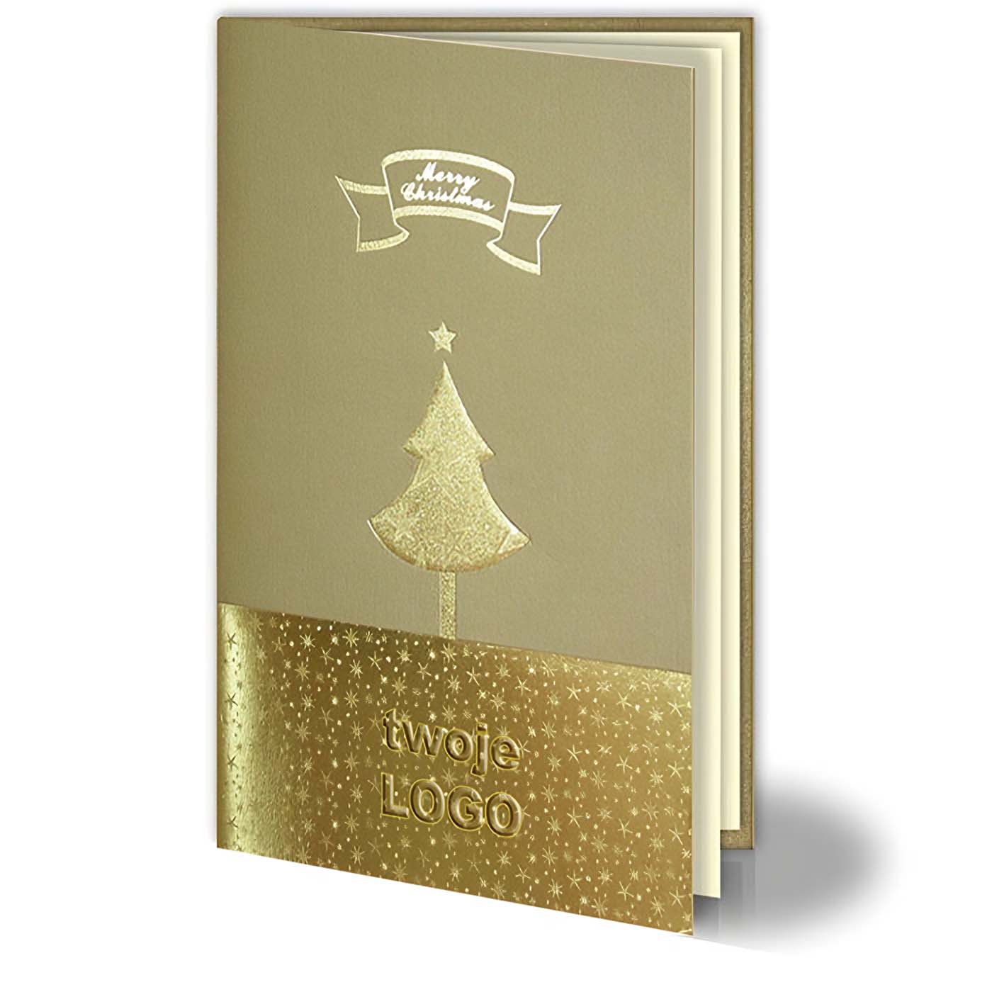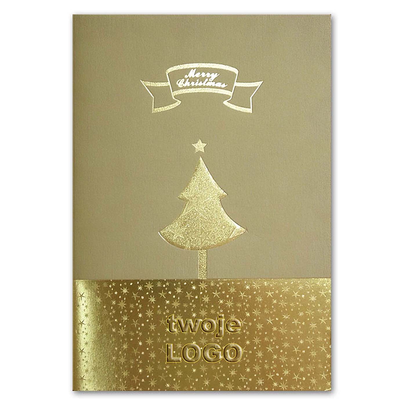 Elegancka kartka świąteczna wykonana z luksusowego, metalizowanego papieru w odcieniu klasycznego złota. Okładkę zdobi połyskujący motyw świąteczny wykonany techniką hot-print w kolorze złotym. Centralna choinka została dodatkowo wytłoczona, co nadaje kartce trójwymiarowy charakter i wyczuwalną fakturę. Dół okładki wzbogacony jest złotym ornamentem w postaci rozgwieżdżonego pasa, idealnym miejscem na tłoczone logo Twojej firmy. Wkładka w kolorze ecru matowym stanowi subtelne tło dla nadruku życzeń.