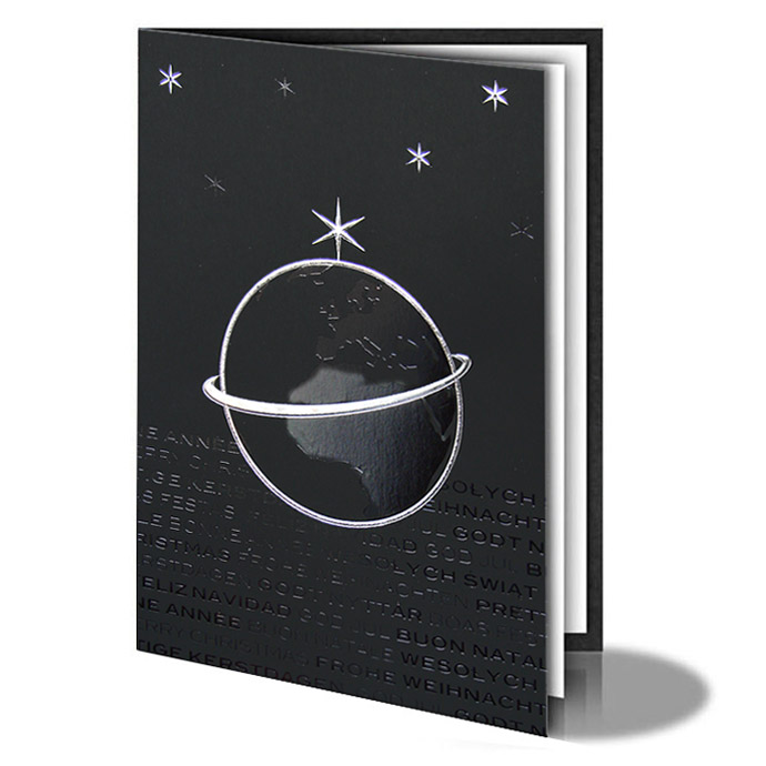 Karta świąteczna wykonana z matowego papieru w kolorze czarnym.Na okładce znajduje się kula ziemska ozdobiona srebrną i czarną folią.W tle znajdują się życzenia w różnych językach wykonane czarną folią. Całość ozdabiają srebrne oraz czarne gwiazdki. Niektóre elementy zostały dodatkowo wytłoczone.Wkładka do nadruku w kolorze białym.