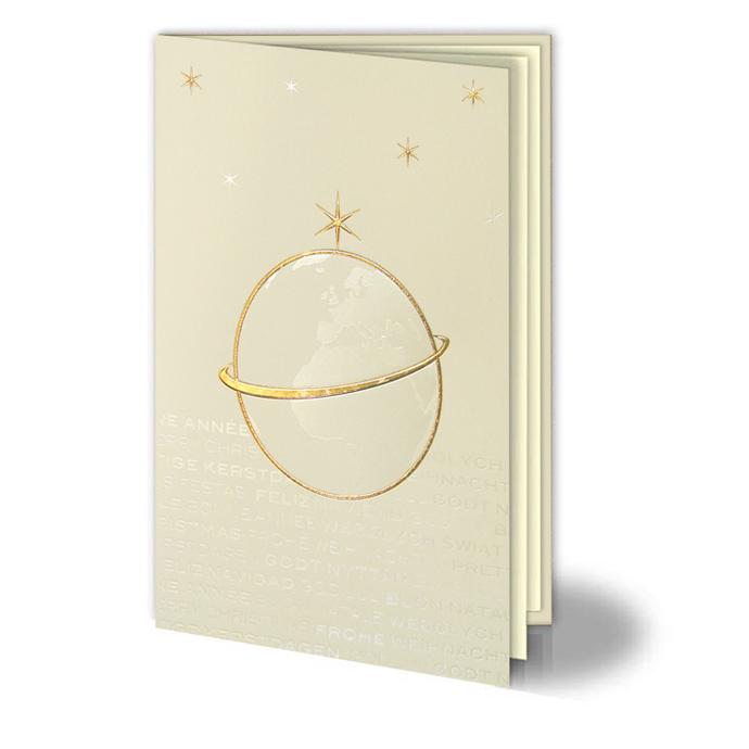 Karta świąteczna wykonana z matowego papieru w kolorze ecru.Na okładce znajduje się kula ziemska ozdobiona złotą oraz perłową folią.W tle znajdują się życzenia w różnych językach wykonane perłową folią. Całość ozdabiają złote oraz perłowe gwiazdki. Niektóre elementy zostały dodatkowo wytłoczone.Wkładka do nadruku w kolorze ecru.
