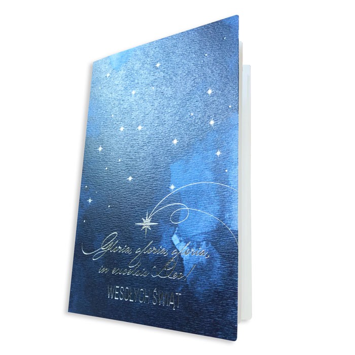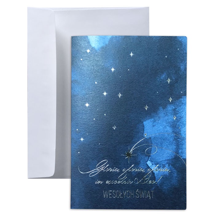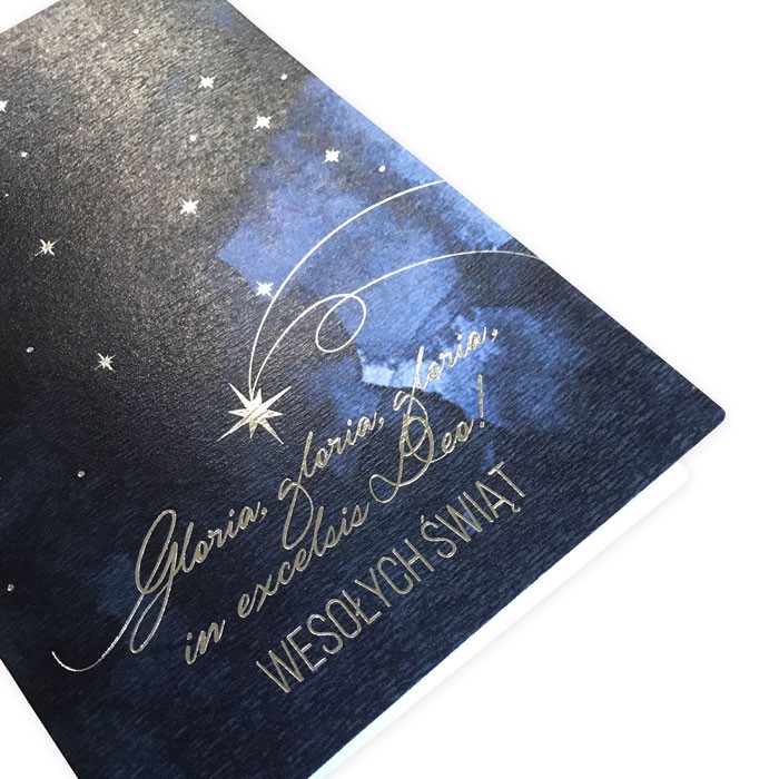 Delikatna i zarazem podniosła kartka świąteczna z pięknym motywem nocnego nieba, namalowanego w stylu akwarelowym. Na granatowym tle lśnią srebrne gwiazdy oraz ręcznie napisany tekst "Gloria in excelsis Deo" - "Chwała na wysokości Bogu". Subtelne tłoczenia i srebrzenie podkreślają świąteczny charakter kartki, nadając jej uroczysty, ale pełen spokoju ton. Wewnątrz znajduje się biała, matowa wkładka do nadruku życzeń i logotypu.