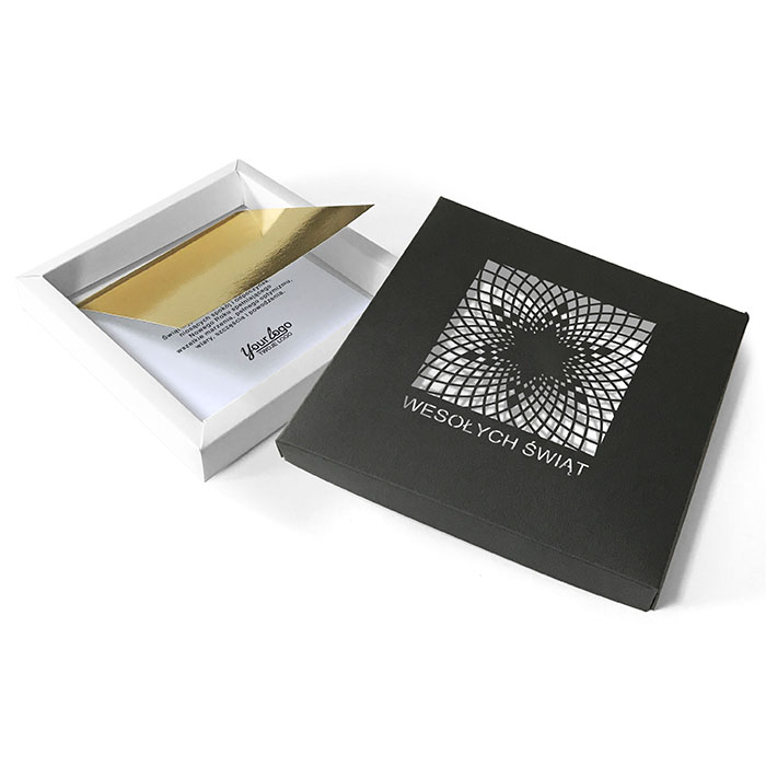 Elegancka kartka świąteczna o wyrafinowanej formie, która zachwyca nowoczesnym data-stylem i precyzją wykonania. Pudełko wykonane z matowego czarnego papieru barwionego w masie, na którego wieczku znajduje się symetryczny, laserowo wycinany motyw gwiazdy oraz napis "Wesołych Świąt". Spód pudełka w kontrastującym białym kolorze podkreśla nowoczesny charakter projektu. Wkładka z jednostronnie złotego papieru stanowi efektowne tło dla wyciętego wzoru i idealne miejsce na nadruk życzeń oraz logotypu - bez dodatkowych opłat.