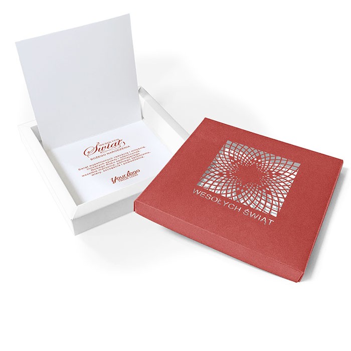 Ekskluzywna kartka świąteczna w niebanalnej formie eleganckiego pudełka. Górna część wykonana została z wysokiej jakości matowego papieru barwionego w masie na intensywny czerwony kolor. Nowoczesne, ażurowe wycięcie laserowe w kształcie gwiazdy nadaje całości efektownego charakteru. Tło dla wycinanego motywu stanowi złota wkładka, która pięknie połyskuje i wzmacnia wrażenie głębi. Spód pudełka w odcieniu bieli podkreśla kontrast i elegancję. Wewnątrz znajduje się miejsce na nadruk życzeń i logotypu - bez dodatkowych kosztów. Doskonała forma zarówno do wręczenia osobiście, jak i wysyłki (w kopercie bąbelkowej - nie dołączona do zestawu).