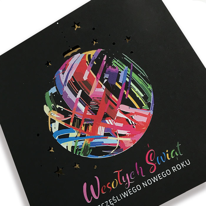 Nowoczesna, wyrazista kartka świąteczna, która przyciąga wzrok intensywną, artystyczną kompozycją. Na czarnej, matowej okładce o gumowej strukturze umieszczono kolorową bombkę w stylu abstrakcyjnych pociągnięć pędzla, otoczoną wyciętymi laserowo złotymi gwiazdkami. Nadruk "Wesołych Świąt i Szczęśliwego Nowego Roku" wykonany został w tęczowym gradiencie, podkreślając radosny i nowoczesny charakter projektu.