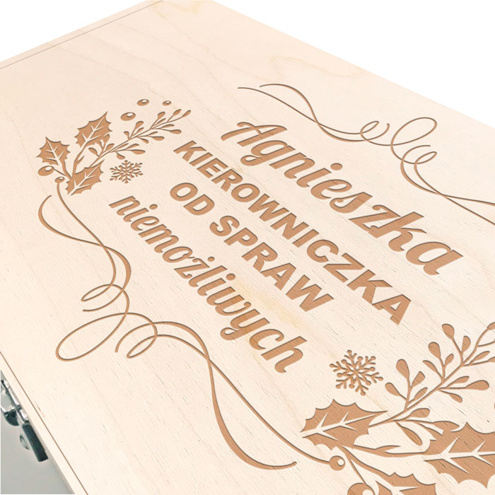 Wyjątkowe drewniane pudełko z zabawnym grawerem "Kierowniczka od spraw niemożliwych" to świetny sposób na podziękowanie lub wręczenie prezentu w niezobowiązującym, ale stylowym stylu. W centralnej części graweru znajduje się imię - wystarczy podać je przy składaniu zamówienia, a my wykonamy personalizację.