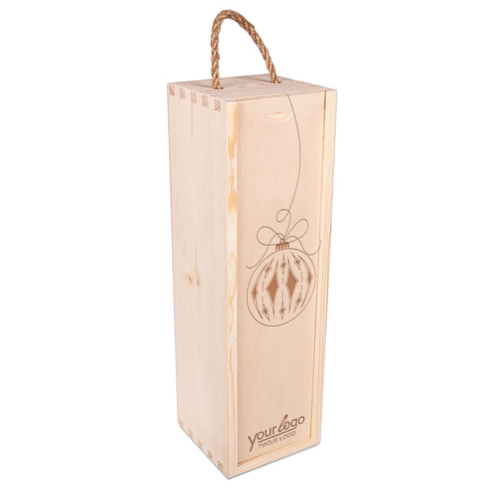 Minimalistyczne, naturalne i eleganckie - drewniane pudełko na wino z grawerowaną bombką to wyjątkowy sposób na wręczenie świątecznego upominku. Wykonane z wysokiej jakości drewna sosnowego, z przesuwaną przednią ścianką i jutowym uchwytem, świetnie sprawdzi się jako prezent dla kontrahenta, pracownika lub bliskiej osoby. W dolnej części skrzynki możliwe jest umieszczenie logotypu - grawer wykonać można za dodatkową opłatą.