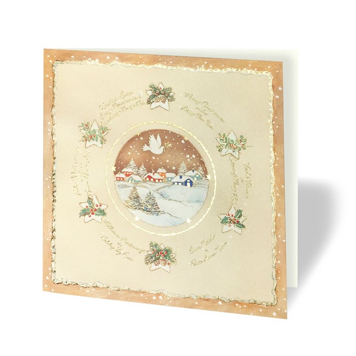 Zestaw kart świątecznych (10 szt.) Karty świąteczne wykonane z wysokiej jakości matowego, delikatnie fakturowanego papieru z motywem świątecznym wykonanym techniką druki uszlachetniony złoceniem. Karty wykonane z ogromną starannością i dbałością o detale.