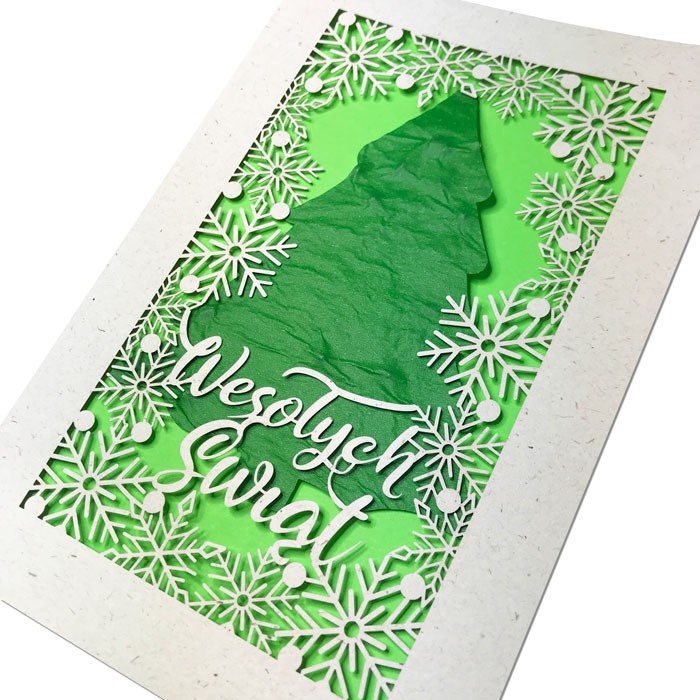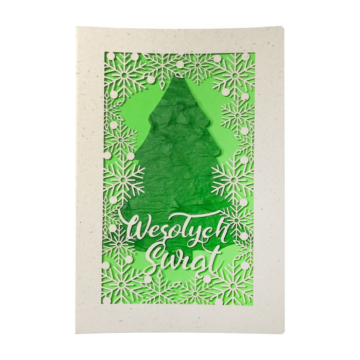 Oryginalna kartka świąteczna z kolekcji ECO DESIGN wykonana z matowego jasnego papieru z widocznymi drobinkami. Okładkę ozdabia cięcie laserowe w postaci śnieżynek i napisu "Wesołych Świąt" Wkładka do nadruku zielona matowa. W centralnej części  znajduję się choinka z wyjątkowego papieru z nasionami świerka pospolitego.przyklejona do wkładki.