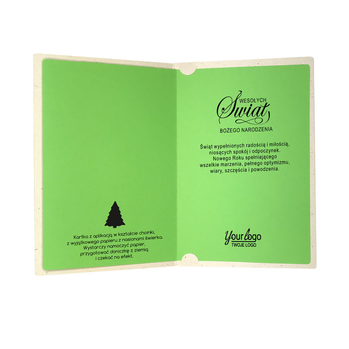 Nasiona są umieszczone pomiędzy dwoma warstwami papieru białego i zielonego. Wystarczy namoczyć papier , przygotować doniczkę z ziemią i czekać na efekt. Wkładka do nadruku z matowego zielonego papieru. Karty wykonane z ogromną starannością i dbałością o detale. Precyzyjny nadruk, dokładność wykonania oraz wysokiej jakości papier.
