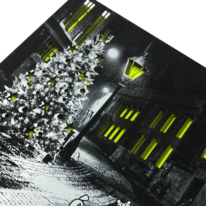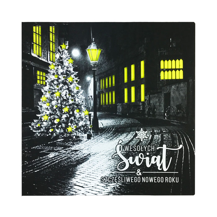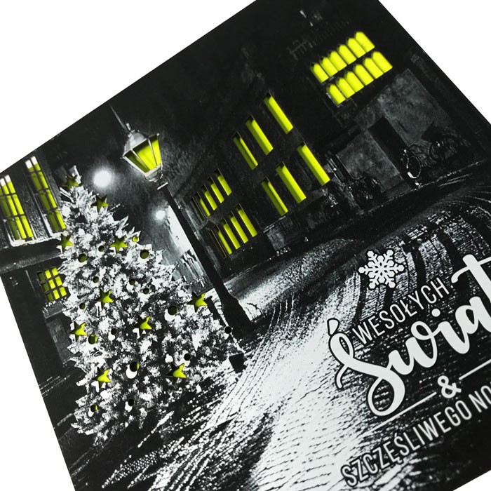 Nowoczesna kartka świąteczna z unikalnym miejskim klimatem - wykonana z czarnego papieru barwionego w masie, ozdobiona białym nadrukiem retro uliczki i choinki. Kontrastujące, fluorescencyjne żółte tło uzyskano dzięki specjalnej wkładce widocznej przez laserowo wycięte detale: okna kamienic, lampy oraz bombki na choince. Taki zabieg tworzy efekt podświetlenia, nadając całości wyjątkowy charakter i głębię wizualną.