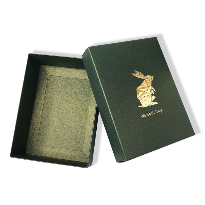 Ekskluzywne pudełka wykonane z wysokiej jakości papieru barwionego w masie. Dekoracyjny motyw wielkanocny został precyzyjnie złocony matrycą 3D, co nadaje mu wyjątkową głębię i elegancję. Możliwość naniesienia logotypu sprawia, że opakowanie idealnie sprawdzi się jako stylowa forma prezentacji upominków firmowych i indywidualnych.