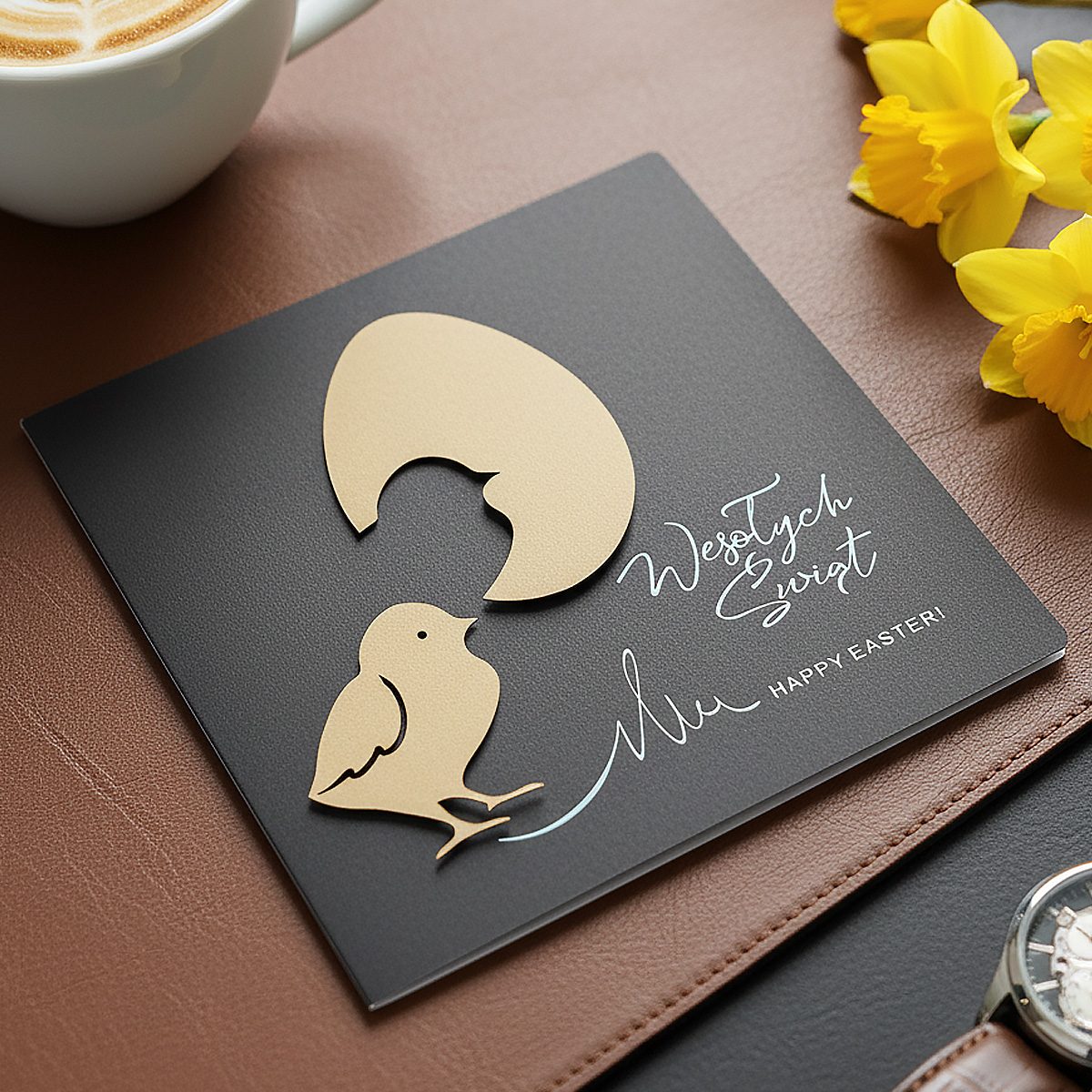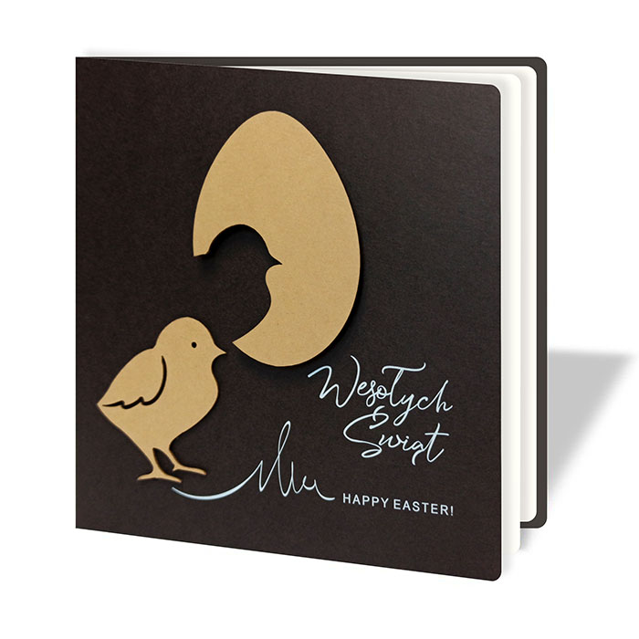 Okładka została wykonana z wysokiej jakości matowego papieru barwionego w masie w kolorze głębokiego brązu, który nadaje całości eleganckiego i stonowanego wyglądu. Centralnym elementem kompozycji są wycięte laserowo aplikacje z grubego kartonu w kolorze złamanej złoci - motyw pisklęcia oraz połówki jajka. Zestawienie prostych kształtów i warstw tworzy subtelny efekt trójwymiarowości, przyciągając uwagę, ale nie dominując formy kartki.