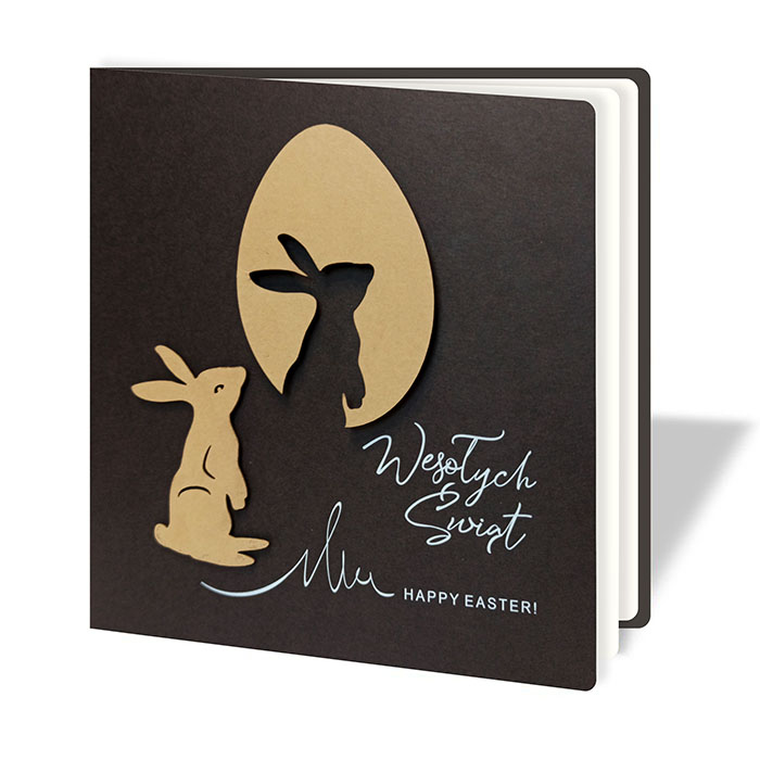 Okładkę zdobią laserowo wycięte aplikacje z grubego kartonu przedstawiające dwa zajączki na tle złocistej pisanki. Delikatny, biały nadruk "Wesołych Świąt" subtelnie dopełnia kompozycję, nadając całości lekkości i nowoczesnego stylu. Wewnątrz kartki znajduje się matowa wkładka w kolorze ecru, która stanowi eleganckie tło dla świątecznych życzeń.