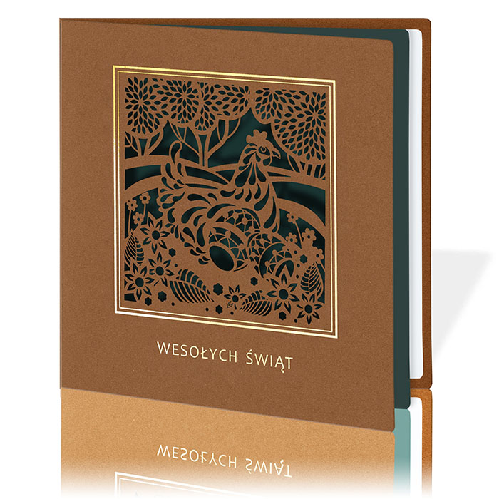 Centralnym elementem okładki jest ażurowy, świąteczny motyw przedstawiający kurę i pisanki, wycięty precyzyjną techniką laserową. Przez wycięcie widoczna jest jednostronnie granatowa wkładka, która tworzy głębokie, kontrastowe tło dla dekoracyjnego wzoru. Całość dopełnia subtelne srebrzenie ramki oraz napisu "Wesołych Świąt", nadające kartce szlachetnego wykończenia i eleganckiego blasku.