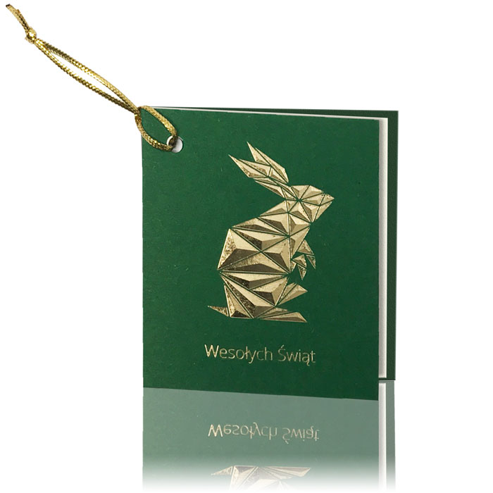 Elegancka zawieszka wielkanocna wykonana z wysokiej jakości papieru ozdobnego barwionego w masie. Na froncie znajduje się tłoczony, złocony zając o geometrycznym wzorze, nadający produktowi ekskluzywny i nowoczesny charakter. Delikatny napis "Wesołych Świąt" podkreśla świąteczny nastrój. Zawieszka jest przewiązana złotym sznureczkiem, co ułatwia jej mocowanie do prezentów, upominków czy koszyczków wielkanocnych.