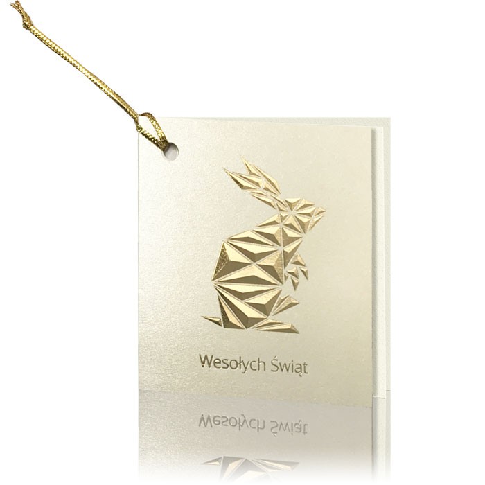 Elegancka zawieszka wielkanocna wykonana z wysokiej jakości papieru ozdobnego barwionego w masie. Na froncie znajduje się tłoczony, złocony zając o geometrycznym wzorze, nadający produktowi ekskluzywny i nowoczesny charakter. Delikatny napis ?Wesołych Świąt? podkreśla świąteczny nastrój. Zawieszka jest przewiązana złotym sznureczkiem, co ułatwia jej mocowanie do prezentów, upominków czy koszyczków wielkanocnych.