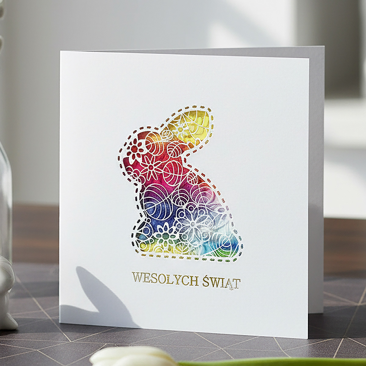 Kartka, która poprzez grę światła, koloru i delikatnego detalu wnosi radość oraz artystyczną świeżość do wielkanocnych życzeń.