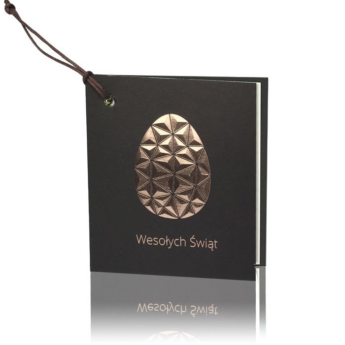 Elegancka zawieszka wielkanocna wykonana z wysokiej jakości papieru ozdobnego barwionego w masie. Na froncie znajduje się tłoczone złocone jajko o geometrycznym wzorze, nadające produktowi ekskluzywny i nowoczesny charakter. Delikatny napis "Wesołych Świąt" podkreśla świąteczny nastrój. Zawieszka jest przewiązana złotym sznureczkiem, co ułatwia jej mocowanie do prezentów, upominków czy koszyczków wielkanocnych.