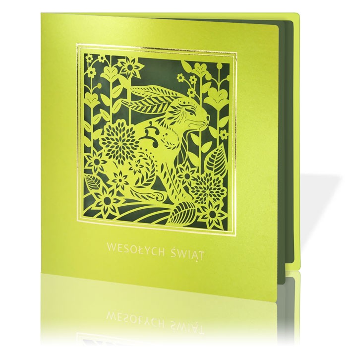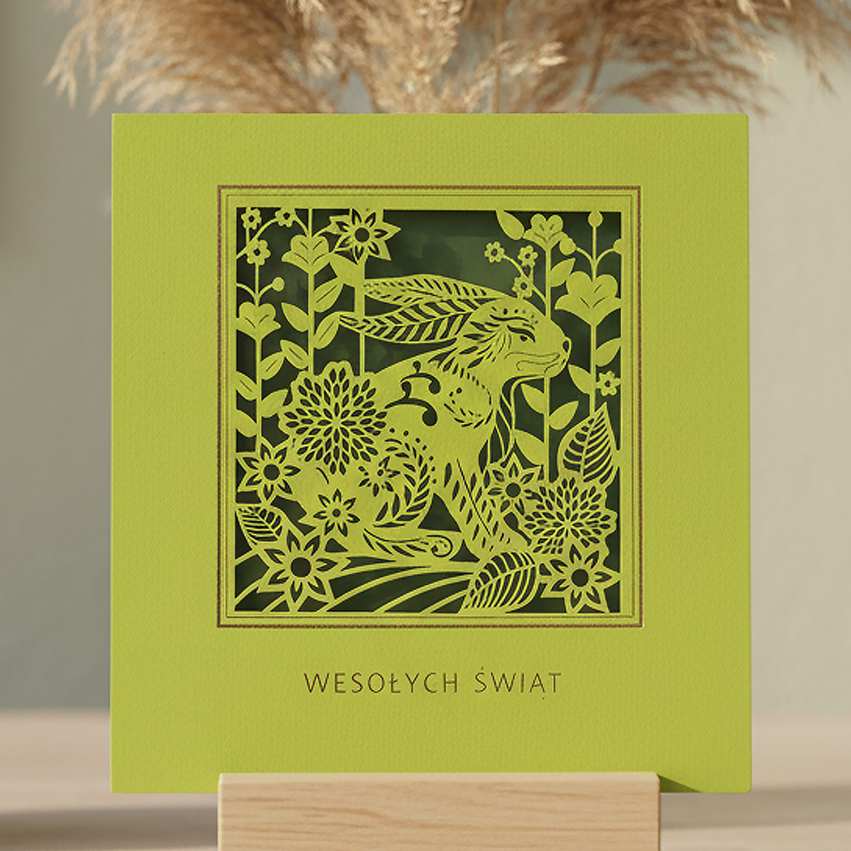 Okładkę zdobi precyzyjnie wycięty laserowo ażurowy motyw wielkanocnego królika, otoczonego roślinnymi ornamentami. Misterny wzór tworzy efekt subtelnej głębi, dzięki czemu kartka prezentuje się lekko i dekoracyjnie, a jednocześnie bardzo elegancko. Jednostronnie zielona wkładka umieszczona wewnątrz kartki stanowi tło dla wycięcia, podkreślając jego detal i kontrast.