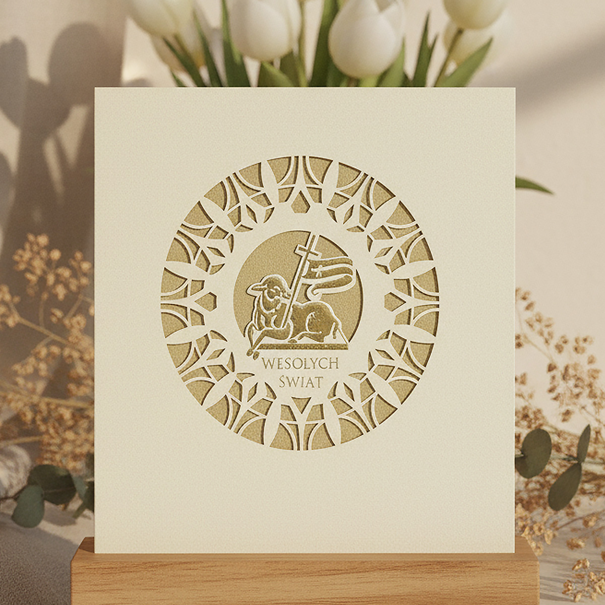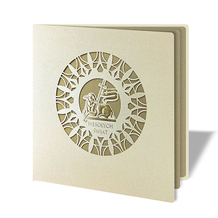 Centralną część okładki zdobi trójwymiarowy motyw Baranka Wielkanocnego z chorągwią, symbolizujący Zmartwychwstanie i zwycięstwo życia. Motyw został wykonany przy użyciu złotej folii oraz precyzyjnego cięcia laserowego, tworząc efekt głębi i eleganckiej ażurowości. Całość ujęta jest w dekoracyjny, geometryczny ornament, który harmonijnie dopełnia kompozycję. Wkładka wewnętrzna, wykonana z metalizowanego papieru barwionego w masie w kolorze złotym, stanowi eleganckie tło dla treści życzeń oraz logotypu.