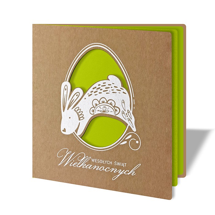 Wyjątkowa kartka wielkanocna wykonana z matowego ekologicznego w stu procentach recyklingowego papieru w kolorze brązowym.