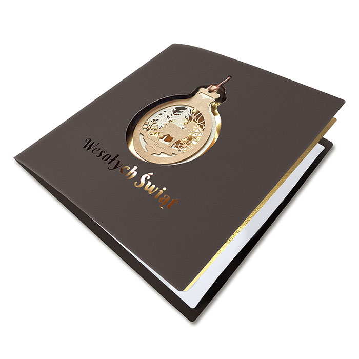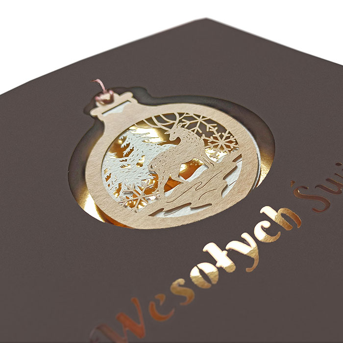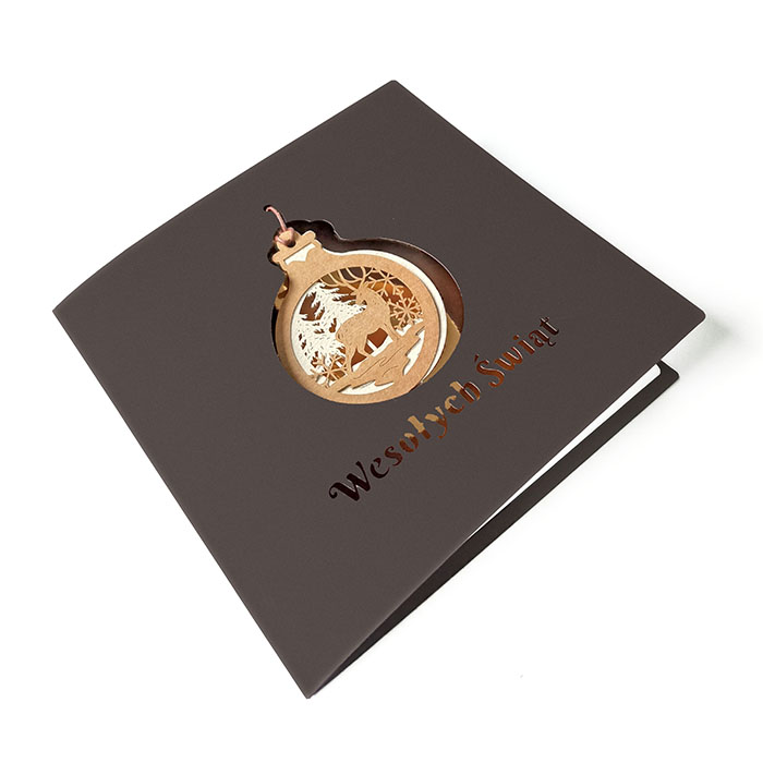 Subtelna i nastrojowa kartka świąteczna, wykonana z eleganckiego papieru barwionego w masie w kolorze głębokiego brązu, o matowej, delikatnie gumowanej strukturze. Na okładce zawieszono warstwową bombkę z ekologicznych papierów, przedstawiającą renifera na tle ośnieżonych drzew. Zawieszkę utrzymuje woskowany sznurek w ciepłym, brązowym odcieniu. Przez wycięcie laserowe na okładce subtelnie przebija złota wkładka, tworząc efekt głębi i światła. Całość dopełnia precyzyjny napis "Wesołych Świąt" wycięty w dolnej części kartki.