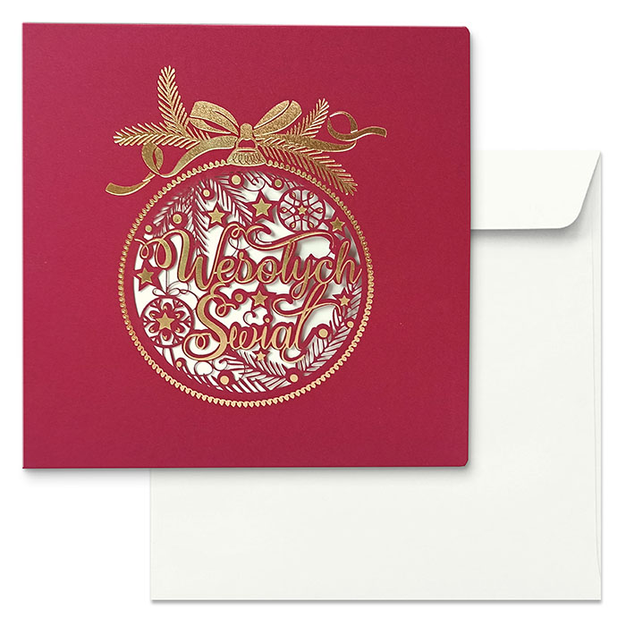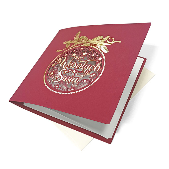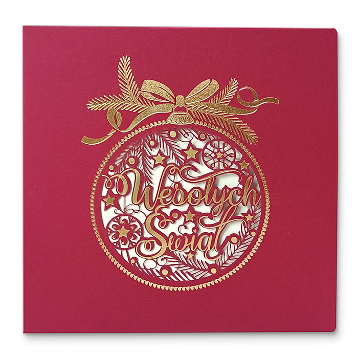 Zachwycająca kartka świąteczna z kolekcji premium, wykonana z wysokiej jakości papieru barwionego w masie w głębokim odcieniu bordo. Na okładce dominuje misternie wycięta laserowo bombka z napisem "Wesołych Świąt", otoczona świątecznymi detalami i ozdobiona złoceniami w technice hotstampingu. Całość wieńczy elegancki złoty motyw z gałązką świerku i kokardą. Dolna część kartki została przygotowana z myślą o personalizacji logotypem, który pięknie kontrastuje z tłem.