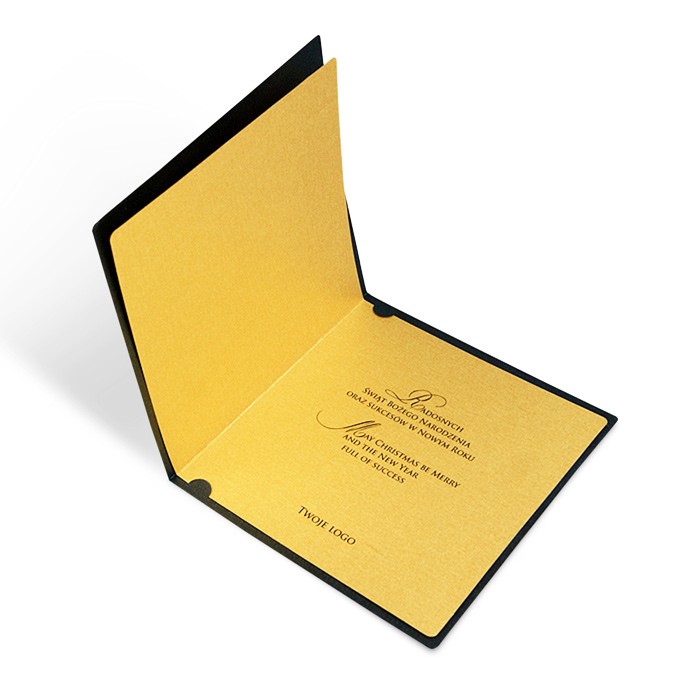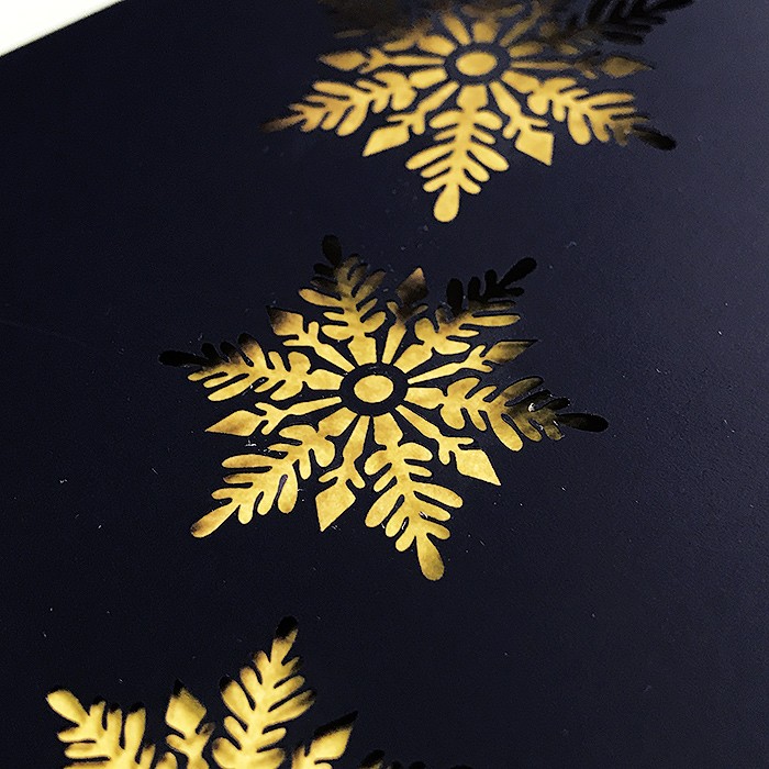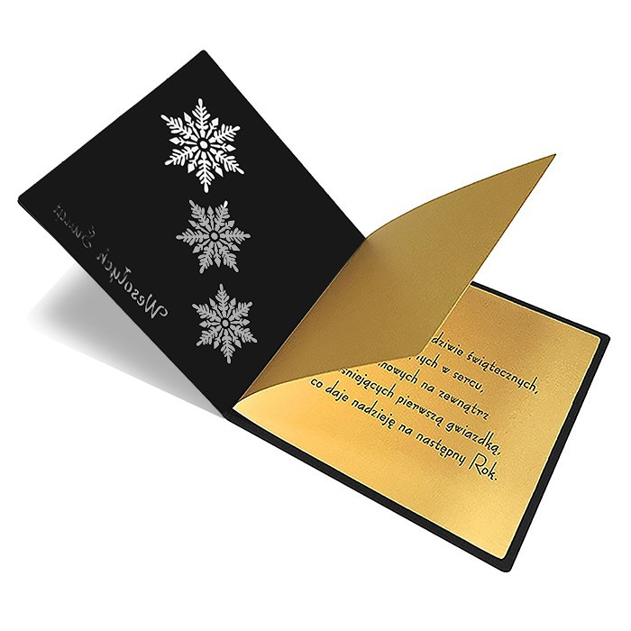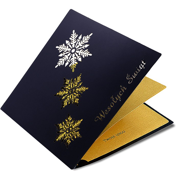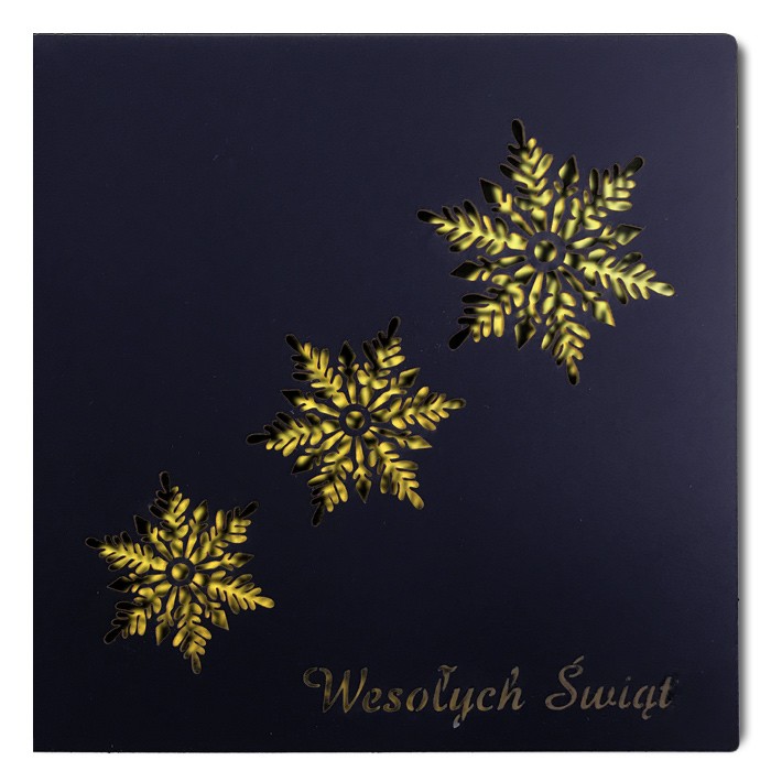 Okładka wykonana z papieru granatowego na zewnętrznej stronie i czarnego od wewnątrz . Na niej znajduje się motyw 3 śnieżynek wykonanych metodą cięcia laserowego. W prawym dolnym rogu został wycięty napis "Wesołych Świąt". W środku wkładka metalizowana w kolorze żółto złotym.
