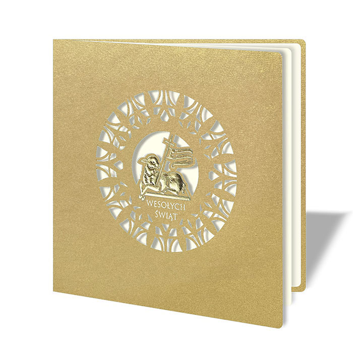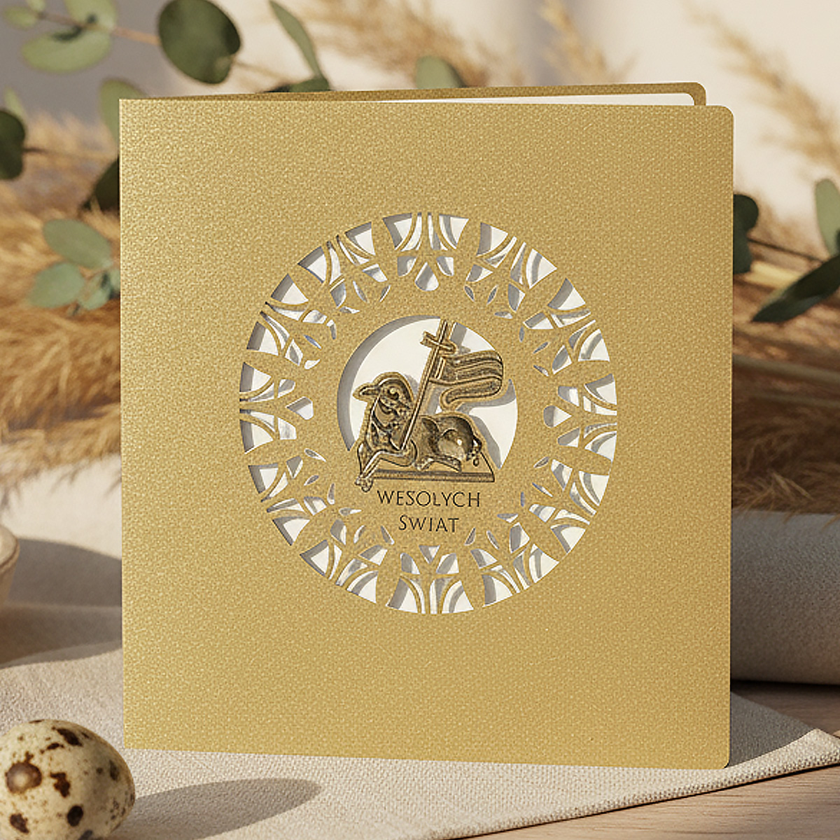 Centralną część okładki zdobi trójwymiarowy motyw Baranka Wielkanocnego, wykonany techniką złocenia oraz precyzyjnego cięcia laserowego. Motyw umieszczony został wewnątrz ażurowego, okrągłego ornamentu, który nadaje kartce lekkości i głębi, a jednocześnie podkreśla jej elegancki charakter. Wnętrze kartki stanowi matowa wkładka w kolorze ecru, przeznaczona do nadruku treści życzeń oraz logotypu.