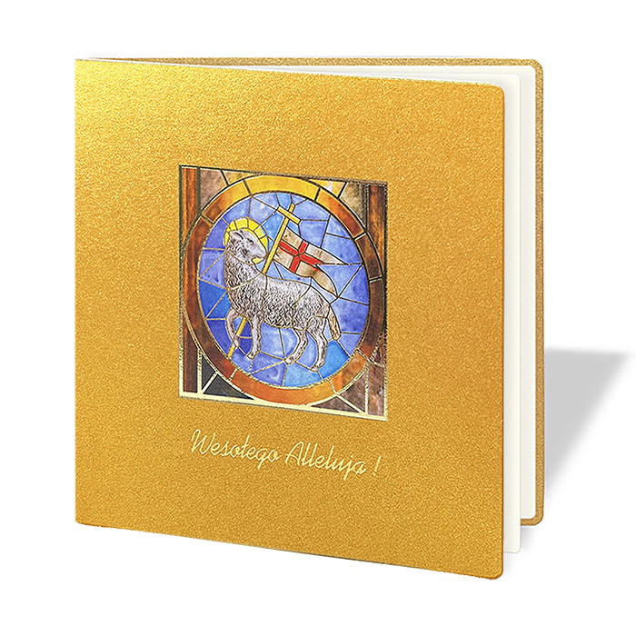 Centralną część okładki zdobi religijny motyw baranka paschalnego, inspirowany stylistyką witrażu. Kolorowa grafika została wykonana innowacyjną techniką druku, która podkreśla głębię barw oraz precyzję detali. Całość uzupełnia elegancki hot-stamping w kolorze złotym, który nadaje projektowi ekskluzywnego charakteru i podkreśla symbolikę Zmartwychwstania. Pod motywem umieszczony został delikatny, złocony napis "Wesołego Alleluja!", harmonijnie dopełniający kompozycję. Wnętrze kartki stanowi gładka wkładka w jasnym odcieniu ecru, przeznaczona do nadruku treści życzeń oraz logotypu.