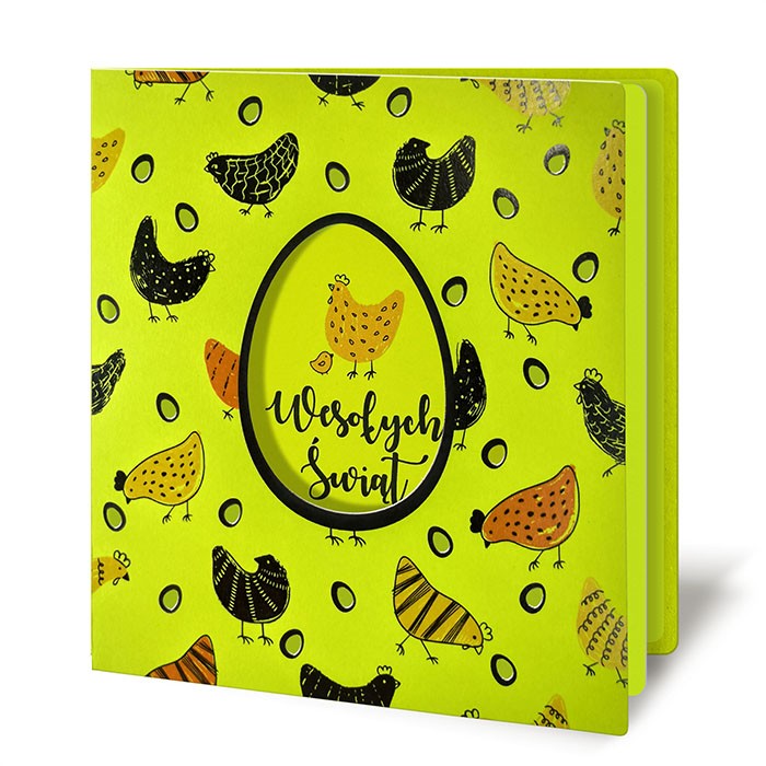 Radosna i nowoczesna kartka wielkanocna z najnowszej kolekcji, utrzymana w intensywnej, wiosennej zieleni. Projekt przyciąga uwagę dynamicznym, kolorowym nadrukiem z motywem kurek i pisanek, który nadaje całości lekki, pogodny charakter i doskonale wpisuje się w świąteczną atmosferę. Okładka została wykonana z matowego papieru w kolorze zielonym i ozdobiona pełnokolorowym nadrukiem. Centralnym elementem jest wycięty laserowo motyw jajka, przez który widoczna jest wkładka, tworząca ciekawy efekt głębi. Całość łączy nowoczesne techniki druku z precyzyjnym wykończeniem i wysoką jakością materiałów. Wnętrze kartki uzupełnia matowa wkładka w kolorze zielonym, przeznaczona do nadruku życzeń. Kartka została wykonana z dużą starannością, z naciskiem na estetykę detali i jakość wykonania. Specyfikacja Dodatkowe informacje Dlaczego warto? Kartka, która wnosi do wielkanocnych życzeń energię, kolor i świeżość w lekkiej, nowoczesnej formie. |