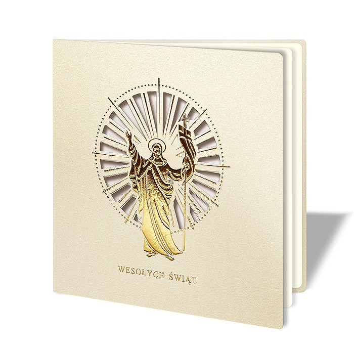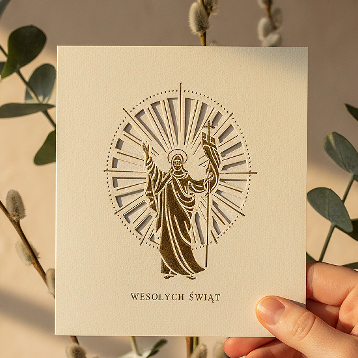 Centralnym elementem okładki jest trójwymiarowy motyw Jezusa Zmartwychwstałego, wykonany techniką złocenia oraz precyzyjnego cięcia laserowego. Postać Chrystusa została umieszczona na tle promienistego ornamentu, symbolizującego światło, odrodzenie i zwycięstwo życia nad śmiercią. Złocony napis "Wesołych Świąt" subtelnie dopełnia kompozycję, nadając jej uroczysty i świąteczny charakter. Wnętrze kartki stanowi matowa wkładka w kolorze ecru, idealna do nadruku treści życzeń oraz logotypu.