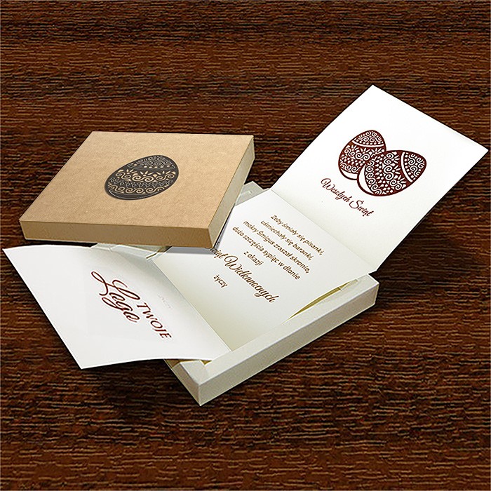 Elegancka i ekologiczna kartka wielkanocna w oryginalnej formie pudełka, łącząca funkcję kartki świątecznej oraz opakowania na drobne upominki lub słodycze.