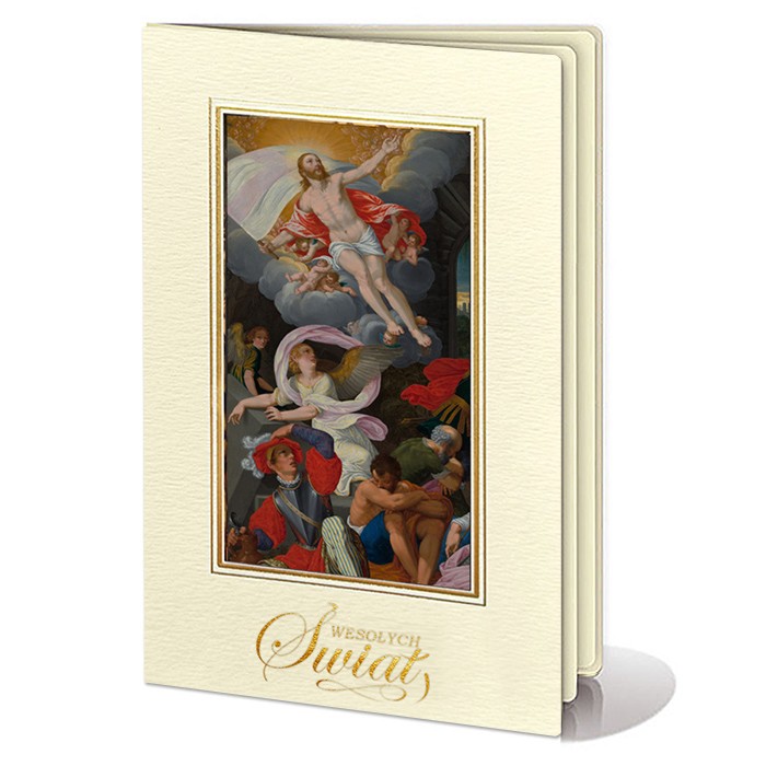 Okładkę zdobi kolorowy motyw religijny w formie malarskiego obrazu przedstawiającego Zmartwychwstanie Chrystusa, ujęty w elegancką, złoconą ramkę, która podkreśla centralną kompozycję i nadaje kartce szlachetnego wyglądu. Pod grafiką umieszczony został ozdobny, złocony napis "Wesołych Świąt", harmonijnie dopełniający całość projektu. Wnętrze kartki stanowi matowa wkładka w kolorze ecru, przeznaczona do nadruku treści życzeń oraz logotypu.