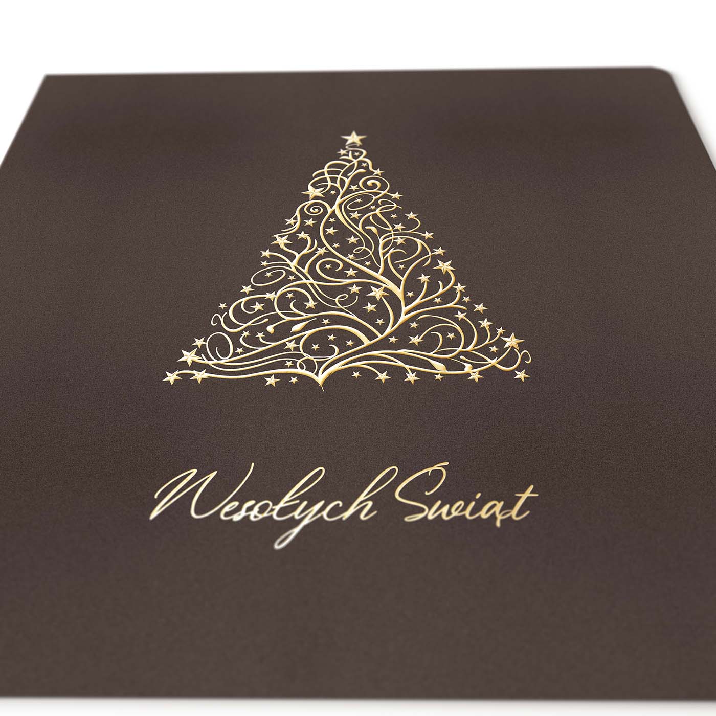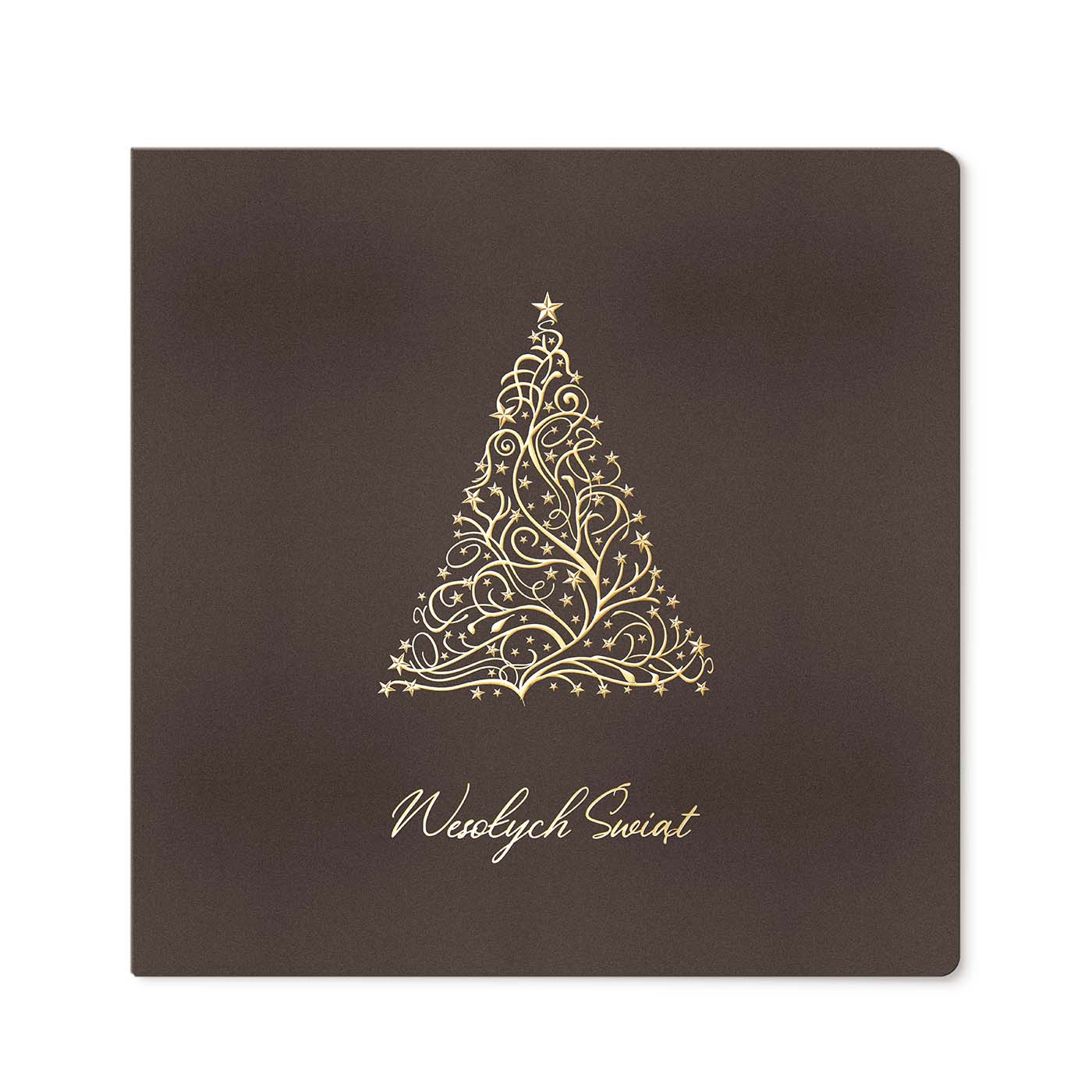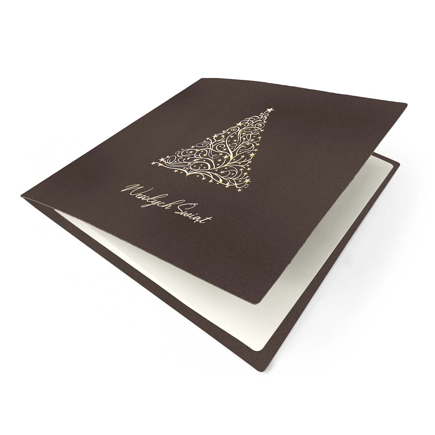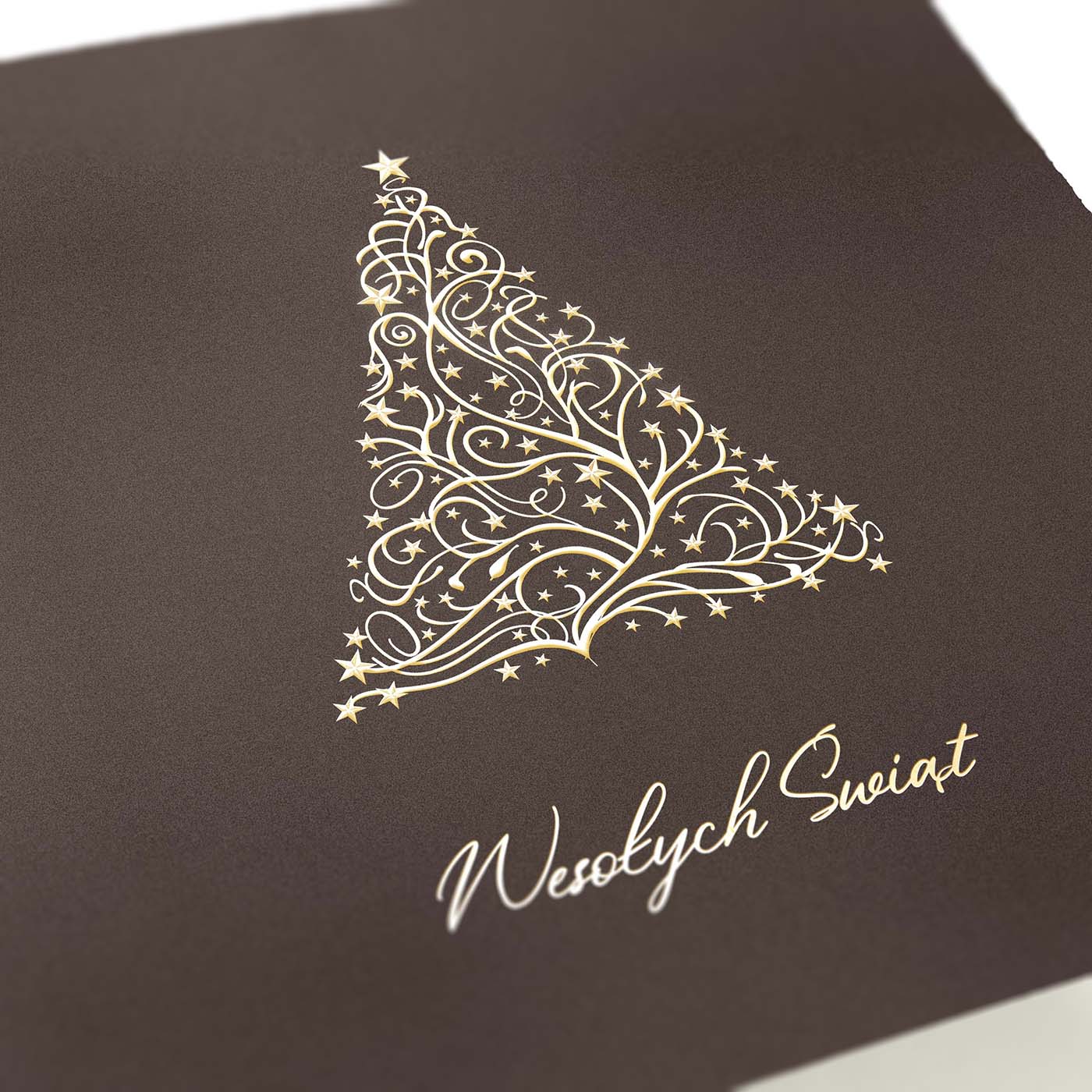 Elegancka karta świąteczna wykonana z wysokiej jakości matowego papieru o gumowej strukturze w kolorze brązowym . Okładkę ozdabia złocona i tłoczona choinka oraz subtelny złocony napis Wesołych Świąt. Wkładka do nadruku ecru matowa. Karty wykonane z ogromną starannością i dbałością o detale. Precyzyjny nadruk, dokładność wykonania oraz wysokiej jakości papier.
