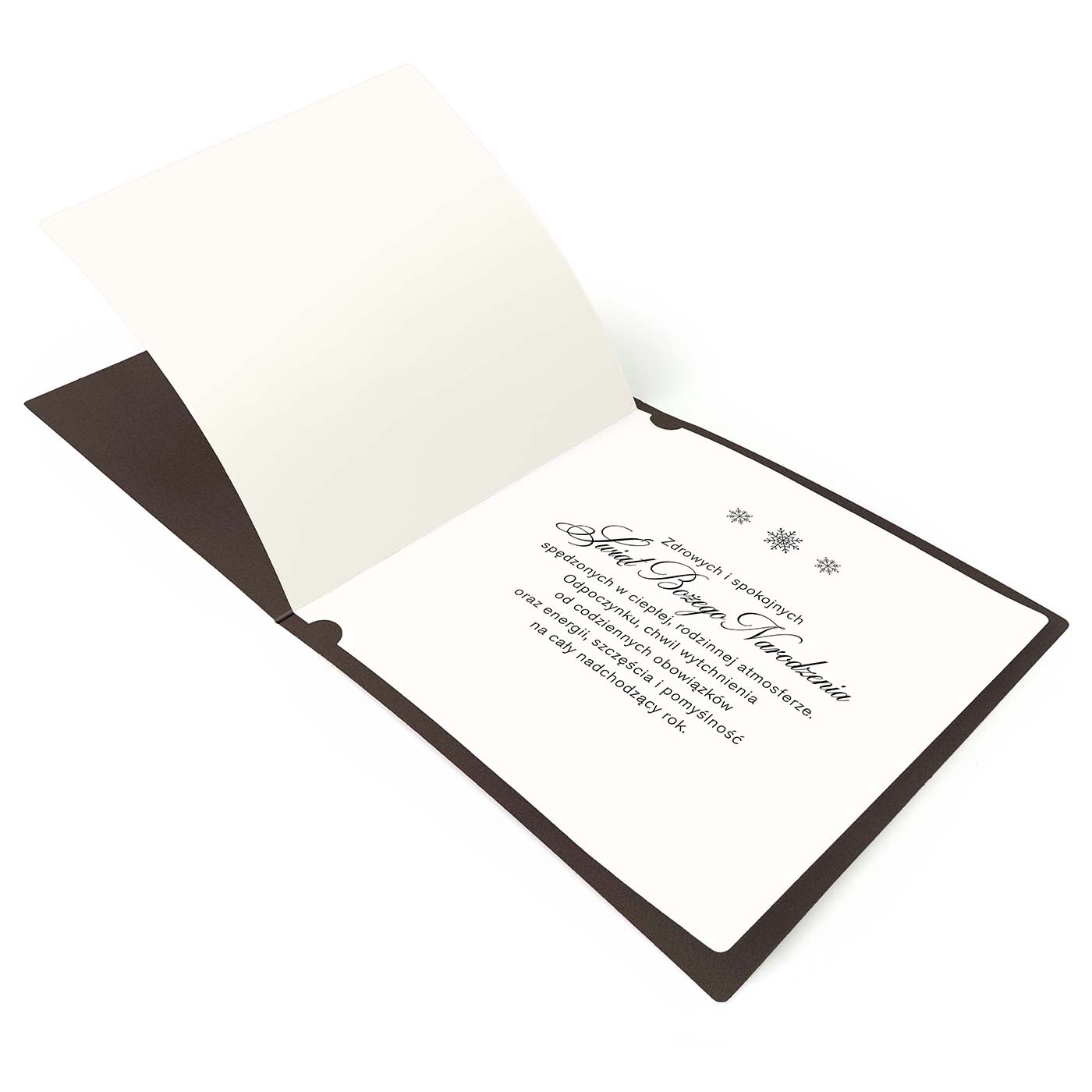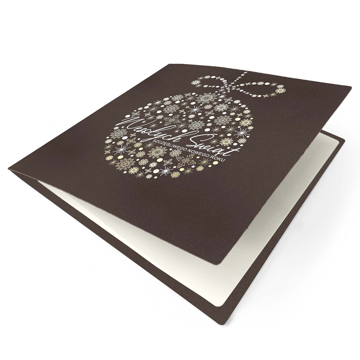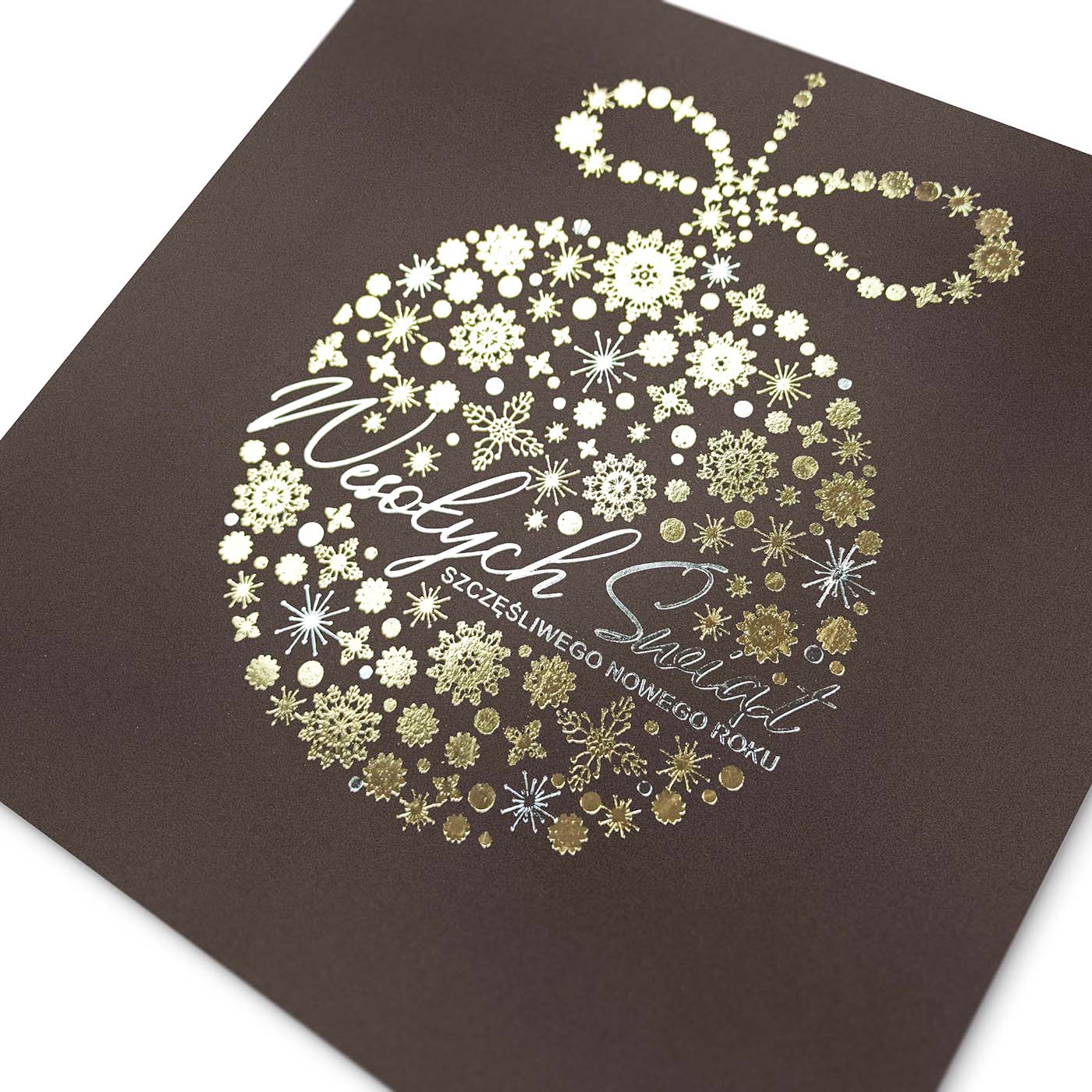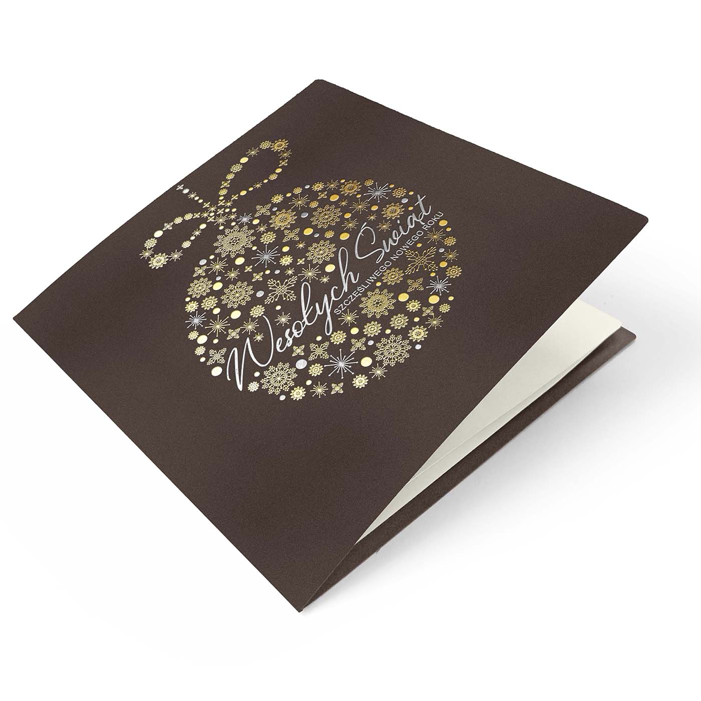 Elegancka kartka świąteczna wykonana z matowego papieru o strukturze przypominającej delikatną gumę, w szlachetnym odcieniu brązu. Okładkę zdobi bombka ułożona z drobnych, połyskujących złotem śnieżynek, wykonanych techniką hotstampingu. Całość dopełnia subtelny, biały napis "Wesołych Świąt", który kontrastuje z ciepłym tłem. Wkładka wewnętrzna w kolorze ecru stanowi idealne tło dla życzeń i logotypu.