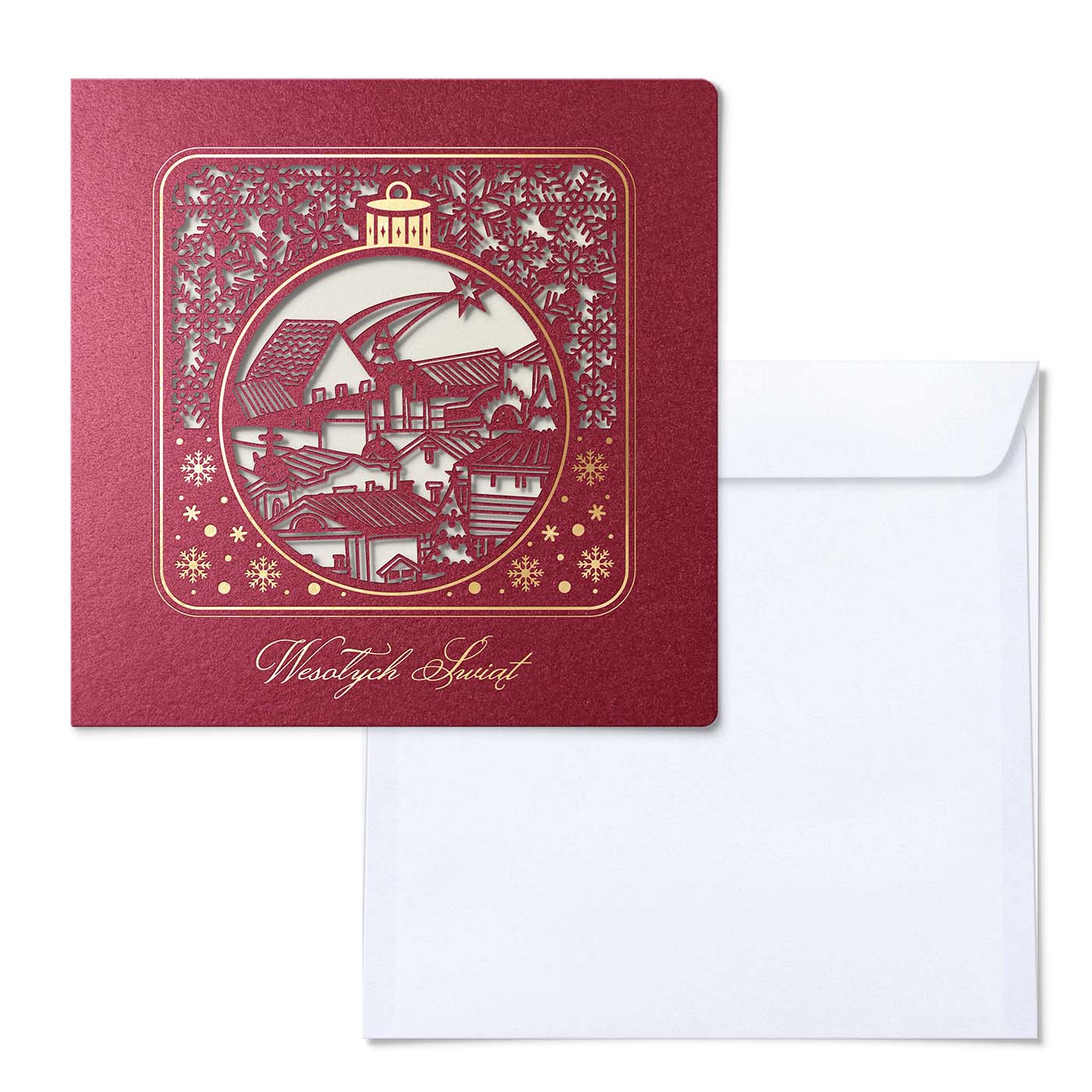 Zjawiskowa kartka świąteczna wykonana z wysokiej jakości bordowego papieru metalizowanego, barwionego w masie. Na okładce umieszczono trójwymiarową bombkę z misternie wyciętym pejzażem dachów i spadającą gwiazdą, otoczoną śnieżynkami i ramką ze złotym hotstampem. Dzięki precyzyjnej technice laserowej wycięcia i błyszczącym akcentom, projekt zyskuje głębię i niepowtarzalny urok. Wnętrze kartki uzupełnia metalizowana wkładka w kolorze ecru.