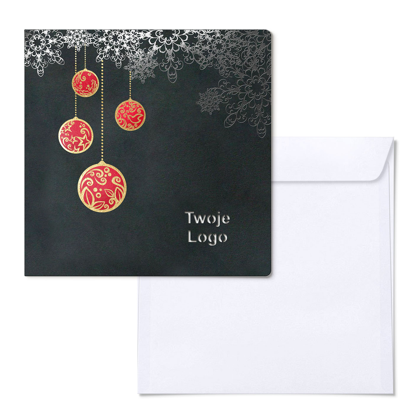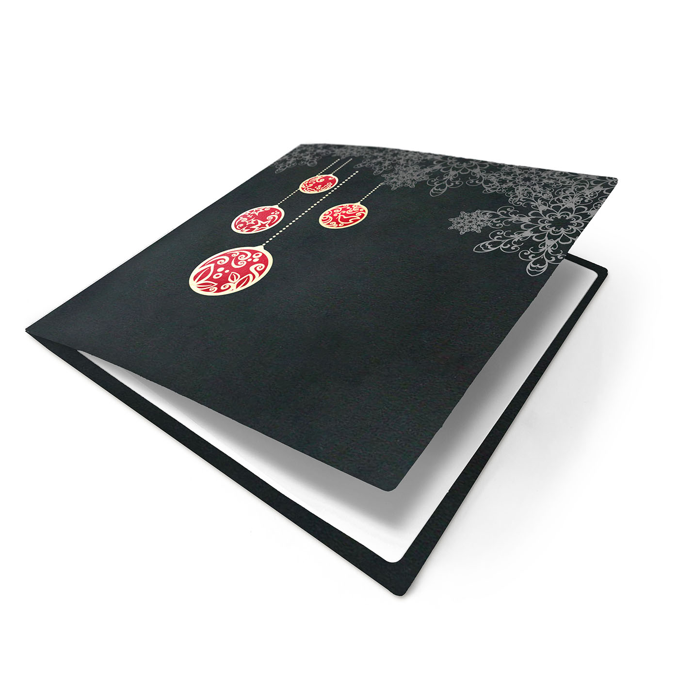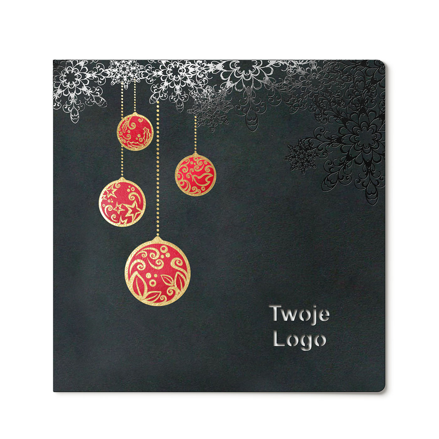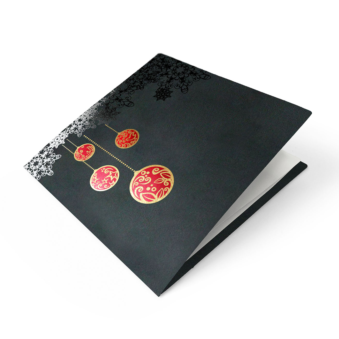 Ekstrawagancka karta w kolorze czarnym. Ozdobiona fantazyjnym wzorem, wykonanym metodą hot-print w kolorze czarnym, bombki w kolorze złoto-czerwonym. Środek z białego papieru.