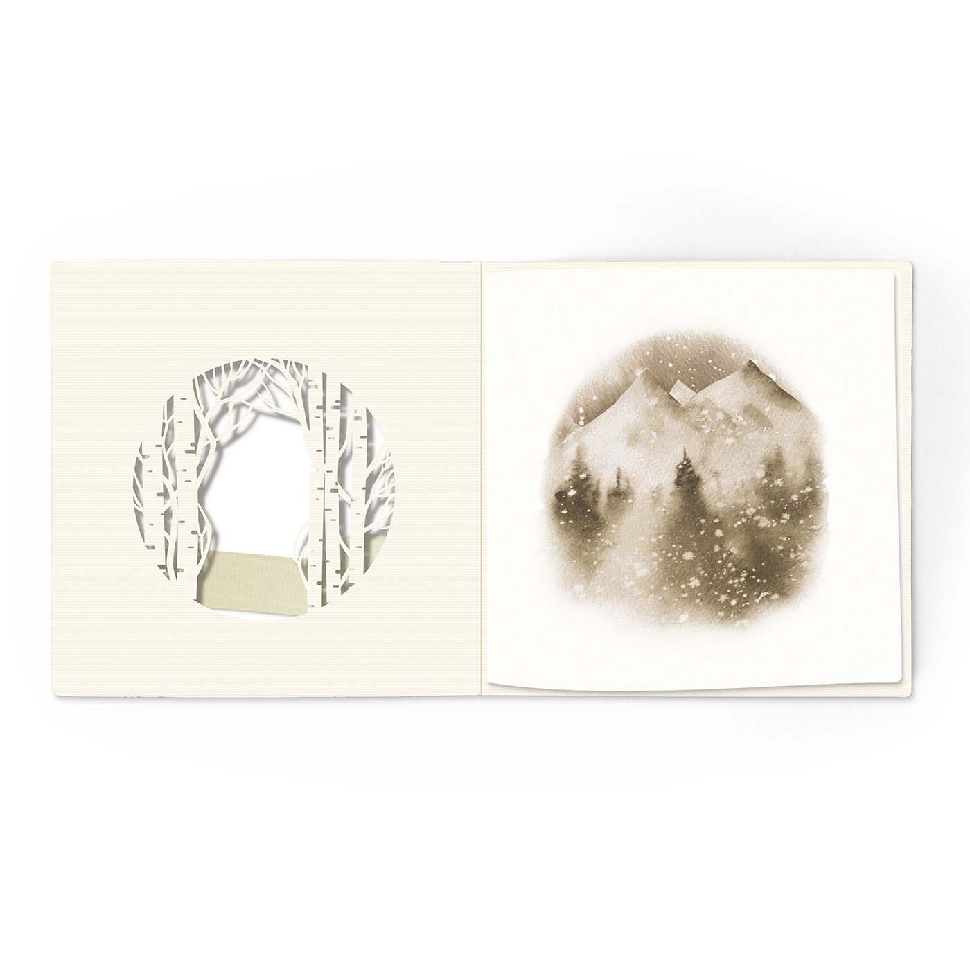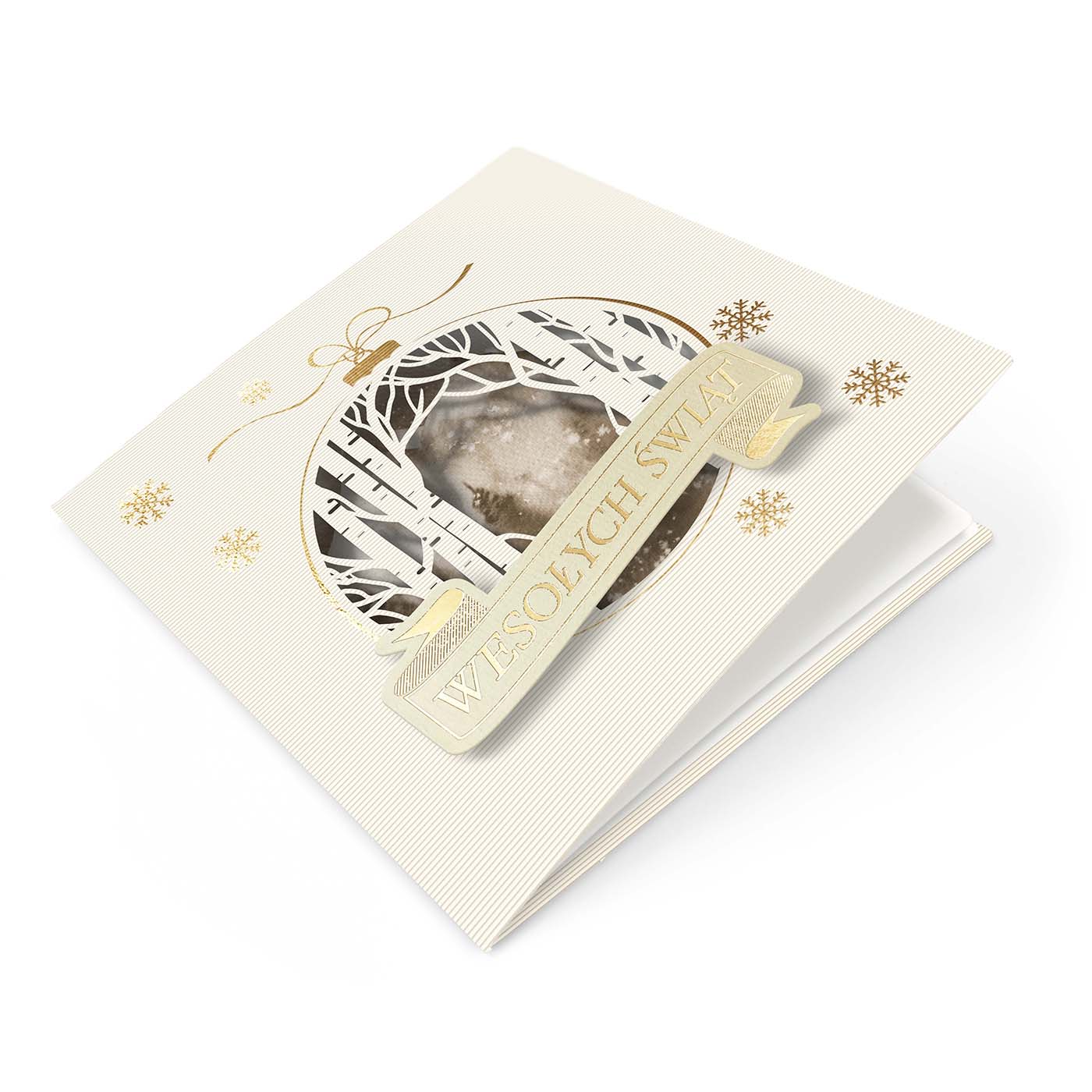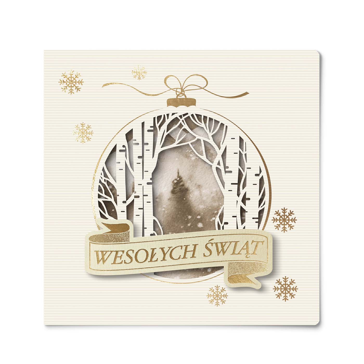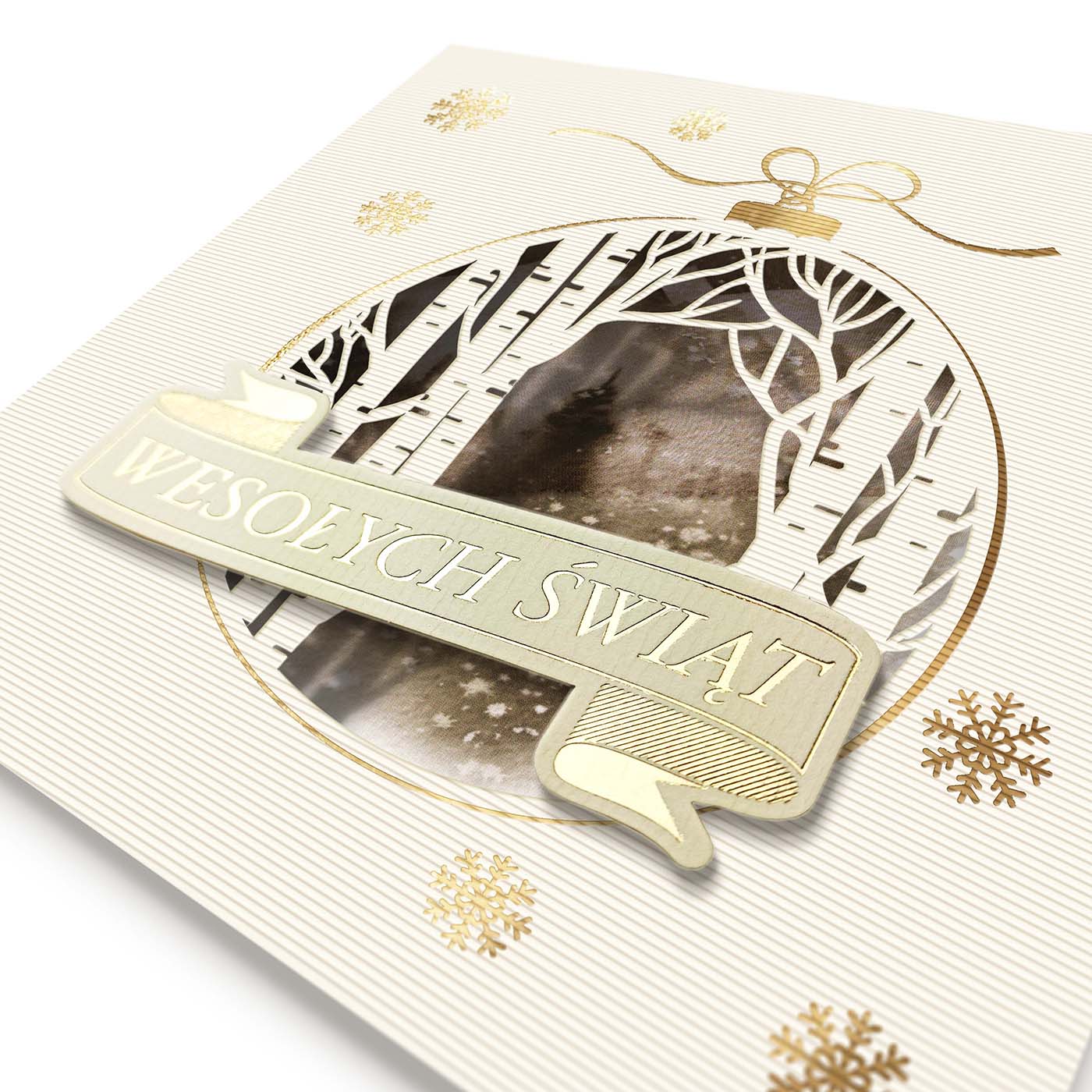 Zachwycająca kartka świąteczna wykonana z eleganckiego, fakturowanego papieru w kolorze ecru. Na okładce znajduje się laserowo wycięty motyw brzozowego lasu zamknięty w kształcie bombki, podkreślony złoceniami w technice hotstampingu. Tło stanowi nadrukowana zimowa grafika na pierwszej stronie wkładki, która buduje iluzję głębi i przestrzenności. Całość wieńczy doklejona aplikacja z napisem "Wesołych Świąt", która unosi się delikatnie ponad okładką, tworząc elegancki efekt 3D.