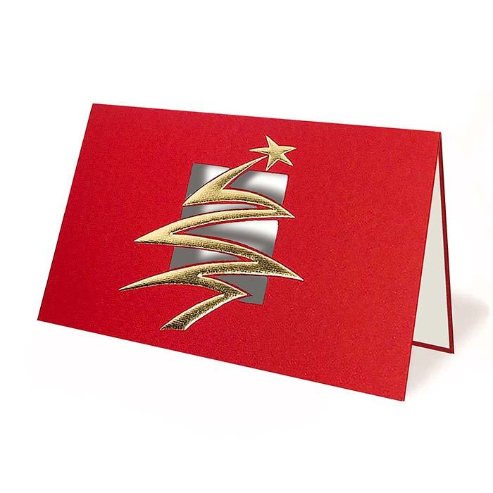 Nowoczesna kartka wykonana z wysokiej jakości ozdobnego matowego, delikatnie fakturowanego papieru w kolorze czerwonym. Na okładce znajduje się choinka wykonana techniką hotstampingu, i tłoczenia. Uroku dodaje wycięcie laserowe w okładce. Wkładka z ozdobnego matowego papieru w kolorze ecru z nadrukowanymi życzeniami.