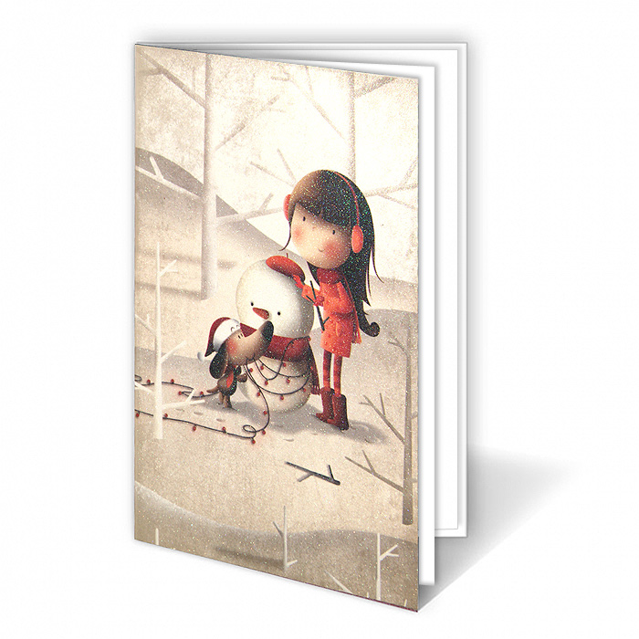 Brokatowa kartka wykonana z białego, matowego papieru. Okładkę ozdabia nadrukowana świąteczna ilustracja obsypana mieniącymi się drobinki z brokatu. Wkładka do własnoręcznego wypisania życzeń lub samodzielnego nadruku biała matowa. Karty wykonane z ogromną starannością i dbałością o detale. Precyzyjny nadruk, dokładność wykonania oraz wysokiej jakości papier.