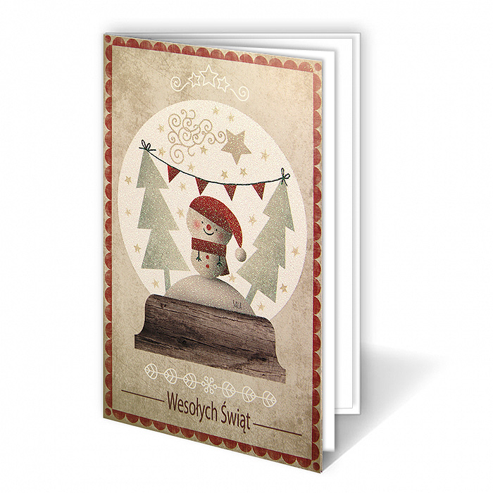 Świąteczna kartka wykonana z białego, matowego papieru. Okładkę ozdabia nadrukowana zimowa ilustracja obsypana mieniącymi się drobinki z brokatu. Wkładka do własnoręcznego wypisania życzeń lub samodzielnego nadruku biała matowa. Karty wykonane z ogromną starannością i dbałością o detale. Nowoczesne techniki drukarskie, dokładność wykonania oraz wysokiej jakości papier są nieocenionym atutem kart.