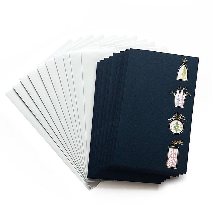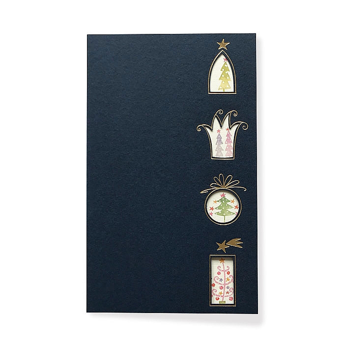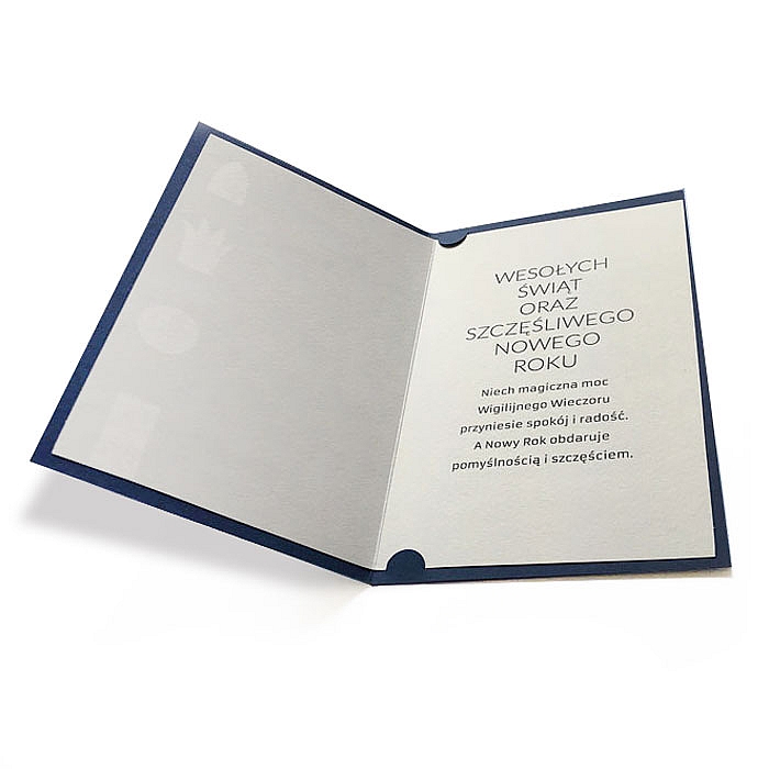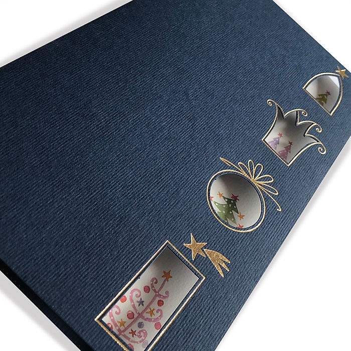 Kartka świąteczna wykonanych z wysokiej jakości ozdobnego papieru barwionego w masie w kolorze granatowym. Na okładce znajduje się motyw świąteczny wykonany techniką cięcia laserowego, wzbogacony o elementy pokryte złotą folią. Grafika na pierwszej stronie wkładki daje tło wycięciu w okładce. Środek ecru. Karty wykonane z ogromną starannością i dbałością o detale. Precyzyjny nadruk, dokładność wykonania oraz wysokiej jakości papier.