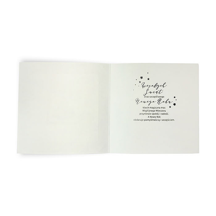 Karta świąteczna wykonana z wysokiej jakości ozdobnego matowego papieru z motywem świątecznym wykonanym techniką druki uszlachetniony złoceniem. Karty wykonane z ogromną starannością i dbałością o detale.