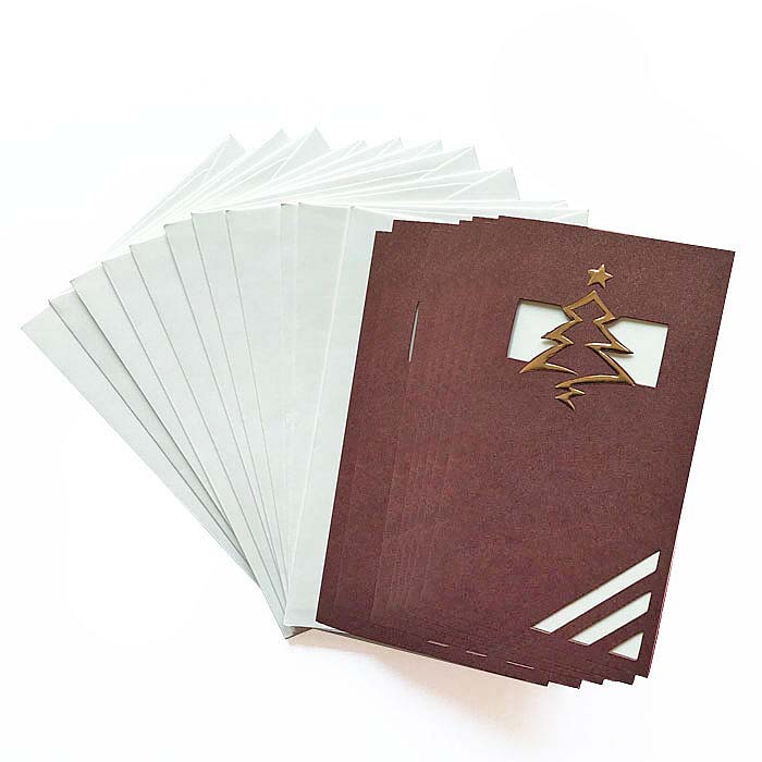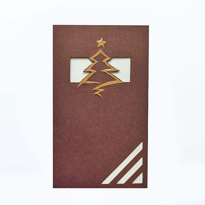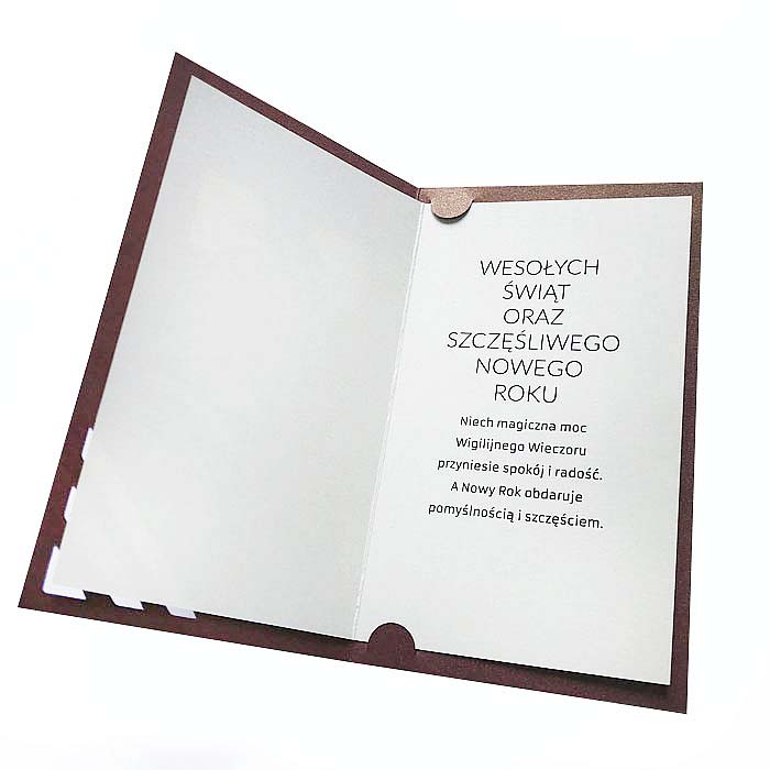 Wyjątkowa kartka wykonana z wysokiej jakości ozdobnego papieru barwionego w masie w kolorze brązowym. Na okładce znajduje się motyw świąteczny wykonany techniką cięcia laserowego, wzbogacony o elementy pokryte złotą folią. Środek ecru. Karty wykonane z ogromną starannością i dbałością o detale. Precyzyjny nadruk, dokładność wykonania oraz wysokiej jakości papier.
