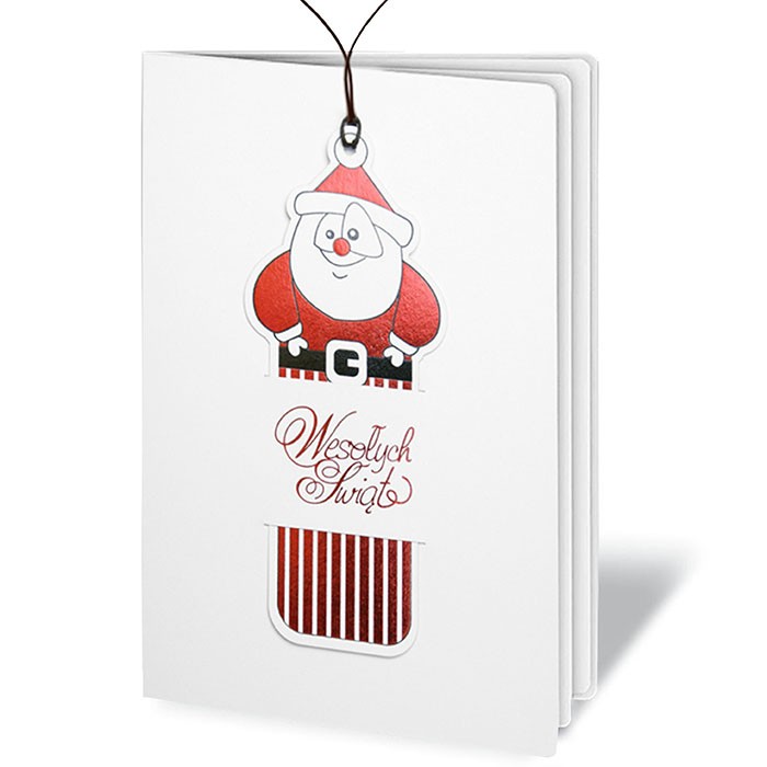 Kartka świąteczna z najnowszej kolekcji wykonana z białego, matowego papieru. Okładkę ozdabia zabawny motyw mikołaja w formie zakładki do książki przewiązany sznurkiem. Na okładce znajduje się napis "Wesołych Świąt" wykonany techniką hot-stampingu w kolorze czerwonym oraz dwa nacięcia pozwalające na umieszczenie aplikacji. Mikołaj wykonany techniką hot-stampingu w kolorze czarnym i połyskującym czerwonym, który pod wpływem światła wydobywa świetliste refleksy. Wkładka do nadruku tekstu biała matowa. Karty wykonane z ogromną starannością i dbałością o detale. Precyzyjny nadruk, dokładność wykonania oraz wysokiej jakości papier.