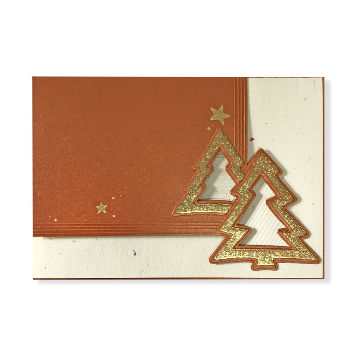 Nowoczesna kartka wykonana z wysokiej jakości ozdobnego metalizowanego papieru barwionego w masie w kolorze miedzi. Na froncie znajdują się dwie choinki wycięte laserowo, uszlachetnione złoceniem wykonanym metodą hotstampingu. Wkładka do nadruku ecru matowa z kolorowymi drobinkami. Karty wykonane z ogromną starannością i dbałością o detale.