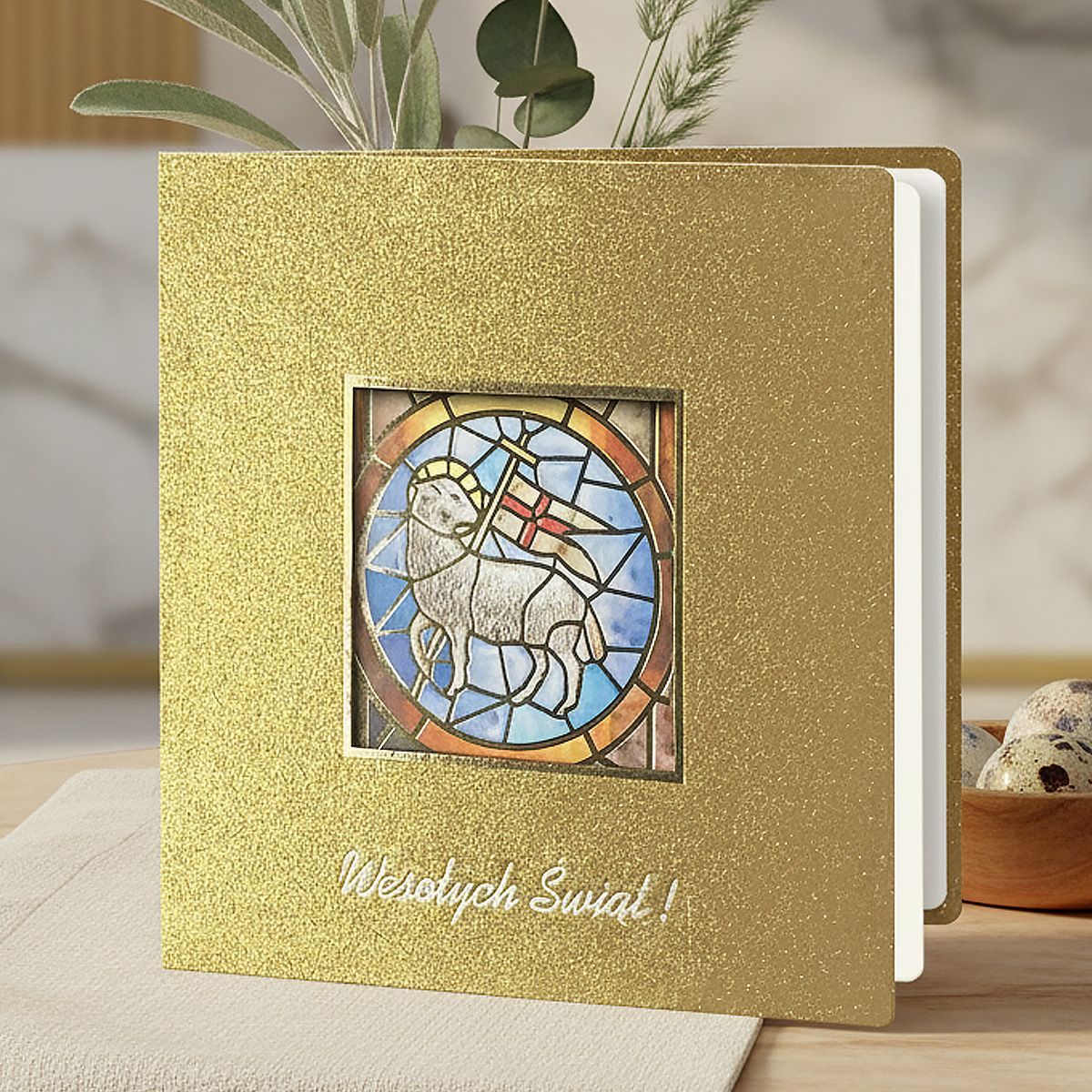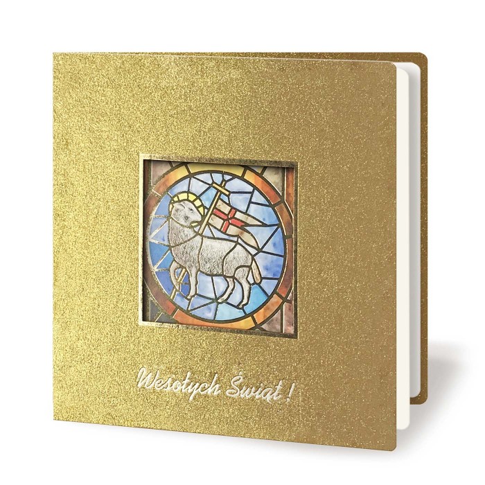 Na okładce znajduje się subtelnie złocona ramka oraz delikatny napis "Wesołych Świąt", które dodają całości elegancji i prestiżu. W centralnej części umieszczono okienko, przez które widoczna jest kolorowa grafika witrażowa z motywem Baranka - symbolu zwycięstwa, ofiary i odkupienia. Złota, metalizowana powierzchnia pięknie współgra z intensywnymi barwami grafiki, tworząc efekt głębi i harmonii. Wnętrze kartki uzupełnia matowa wkładka w kolorze ecru, przeznaczona do nadruku życzeń oraz logotypu.