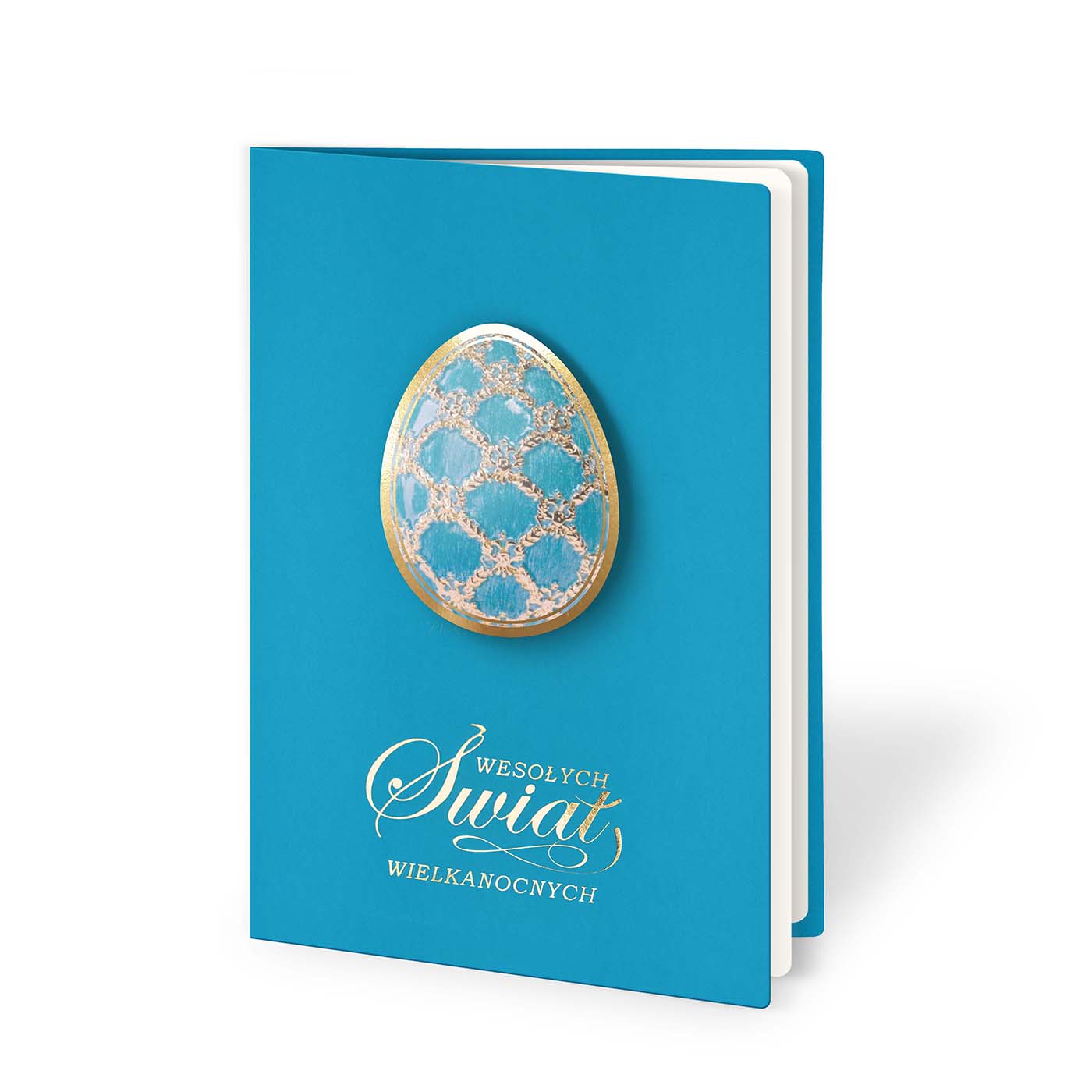 Okładka została wykonana z wysokiej jakości matowego papieru w intensywnym odcieniu turkusu. Jej powierzchnię uszlachetniono złoceniem, które podkreśla elegancki charakter kartki. Centralnym elementem jest nadrukowana i podklejona na dystans aplikacja inspirowana jajkiem Fabergé, z delikatnymi złotymi ramkami, nadająca całości efekt trójwymiarowości i wyrafinowanej głębi. Wnętrze kartki uzupełnia matowa, biała wkładka przeznaczona do nadruku życzeń.
