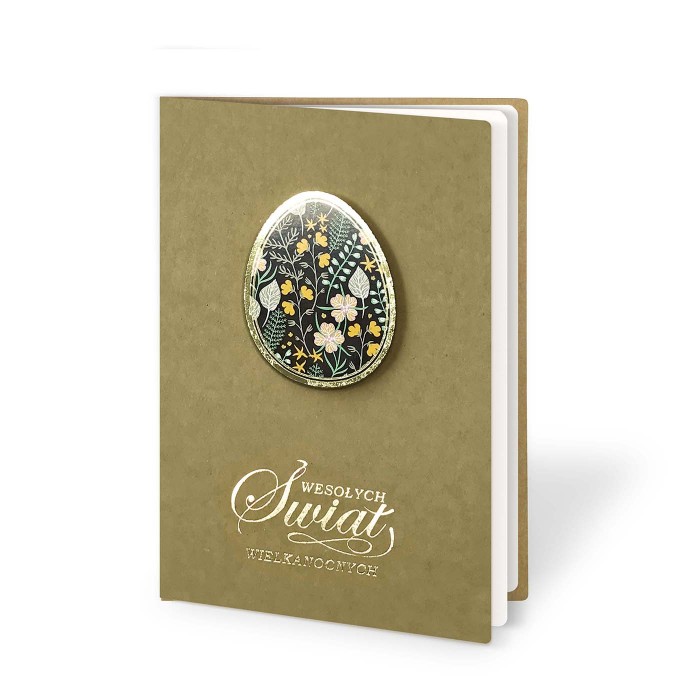 Kartka, która harmonijnie łączy naturę, kolor i złoto, subtelnie podkreślając wyjątkowość wielkanocnych życzeń w eleganckiej, świadomej formie.