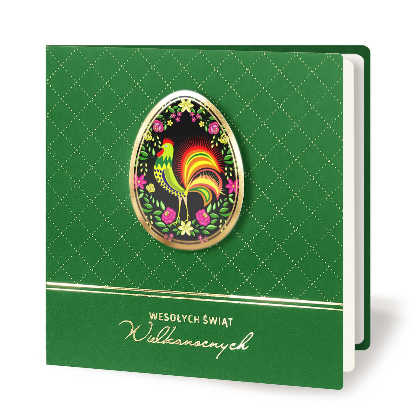 Okładka wykonana została z matowego papieru w kolorze zielonym i uszlachetniona subtelnymi złoceniami, które nadają całości szlachetnego charakteru. Centralnym elementem kompozycji jest dekoracyjna pisanka z kolorowym motywem koguta, nadrukowana i podklejona na dystans, dzięki czemu uzyskano efekt delikatnej przestrzenności. Złota ramka wokół aplikacji elegancko podkreśla motyw i przyciąga wzrok. Całość dopełnia elegancki napis "Wesołych Świąt Wielkanocnych" wykonany w harmonijnej stylistyce.